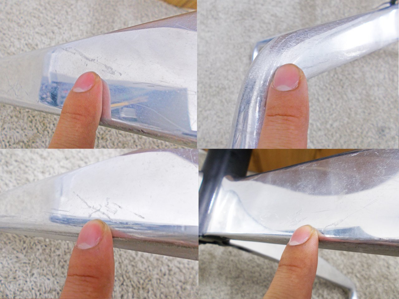 - 目立つ箇所あり傷・凹みが多数、深い傷・凹みが一部ある。(例、天板、幕板、棚板、サイド部分、脚部等にある。)