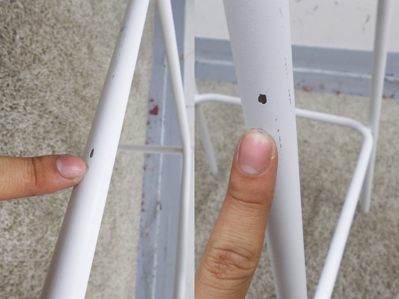 - かなり強い濃い黄ばみ・変色が商品全体にある。(例、座面・背もたれ、脚部等にある。)