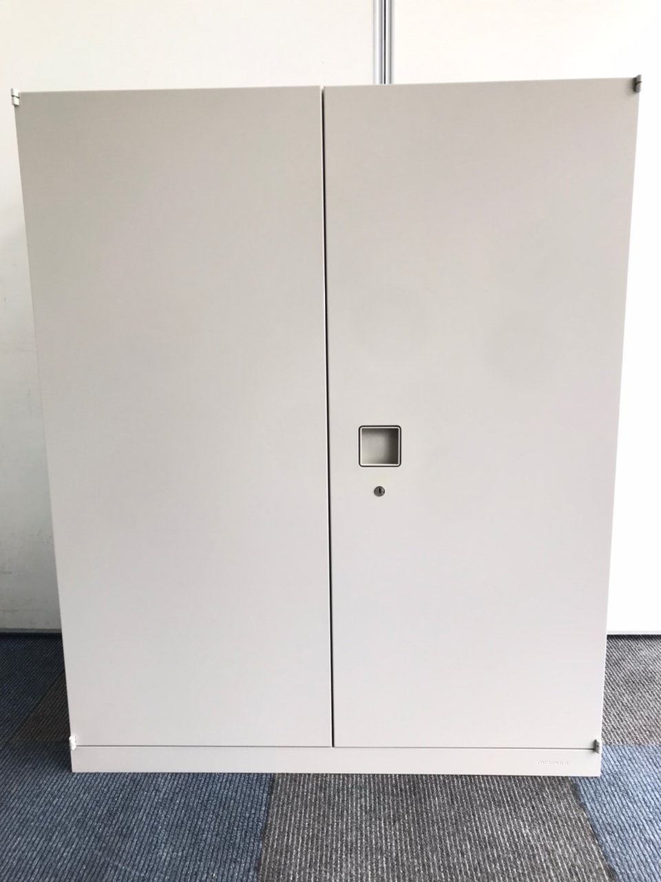 【4台限定】【オフィスの書類をスッキリ整理!取っ手がどの方向からでも開くマルチハンドル!】■オカムラ(okamura)製 レクトラインシリーズ 両開き書庫 ローキャビネット ■シリンダー錠 ■ニューグレー ■ベース付き