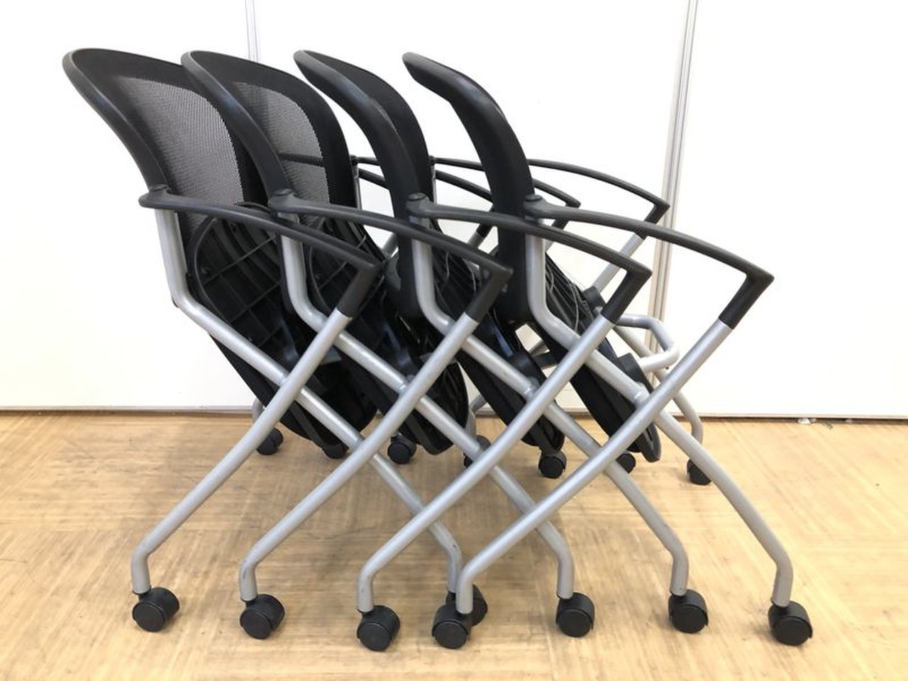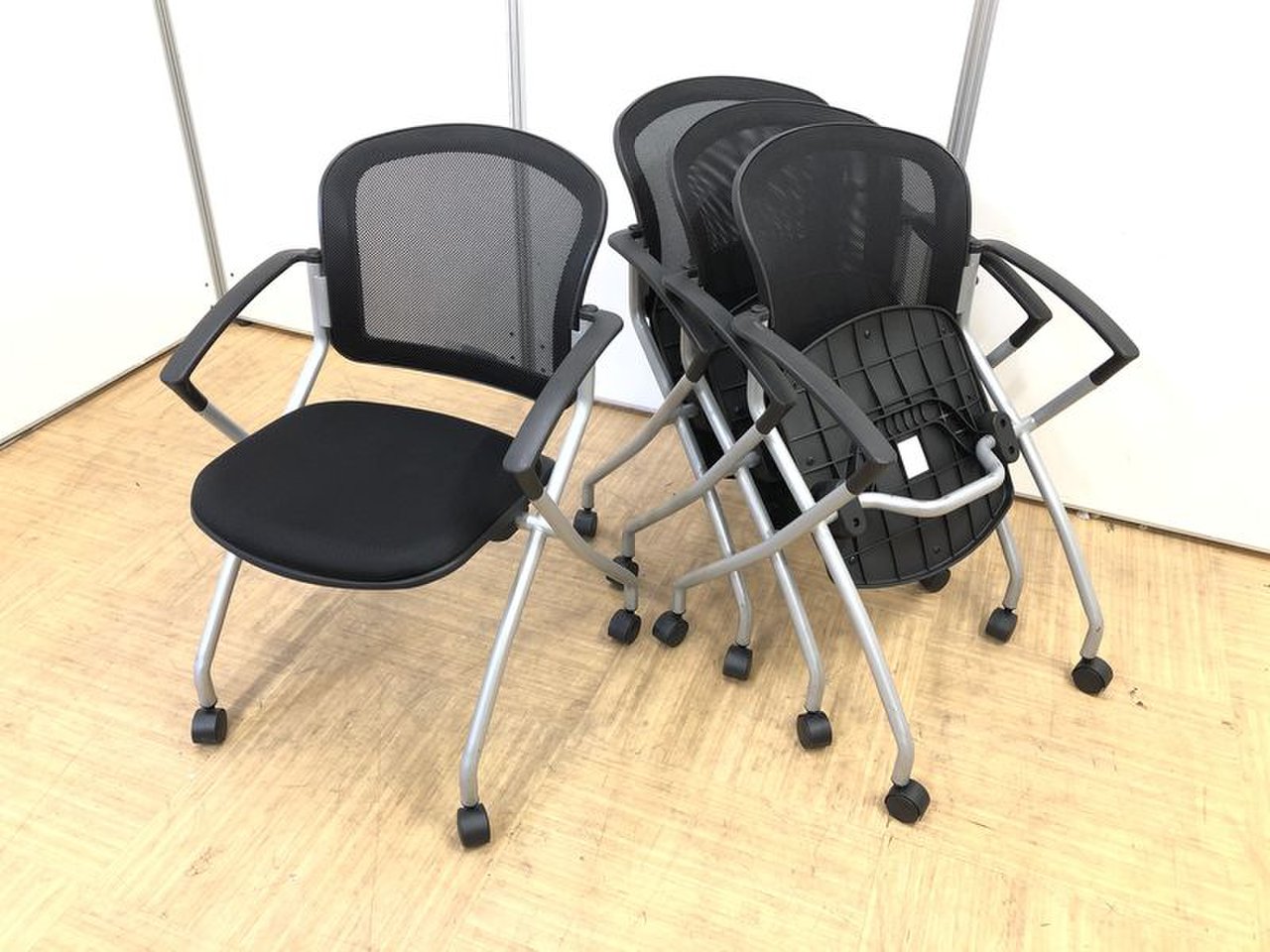 【セットならお得】メッシュ素材のネスティングチェア4脚セット【会議室に是非】- 名古屋本店