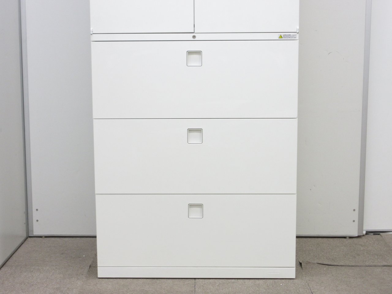 【大量収納の上下書庫!パッと見でわかるオープンタイプと鍵付き引き出しのラテラルセット】オカムラ レクトライン 上下書庫(上:オープン 下:3段ラテラル) 《オフィスバスターズ福岡博多店は、福岡を拠点として、日本全国へ中古オフィス用品・オフィス家具を提供しております》