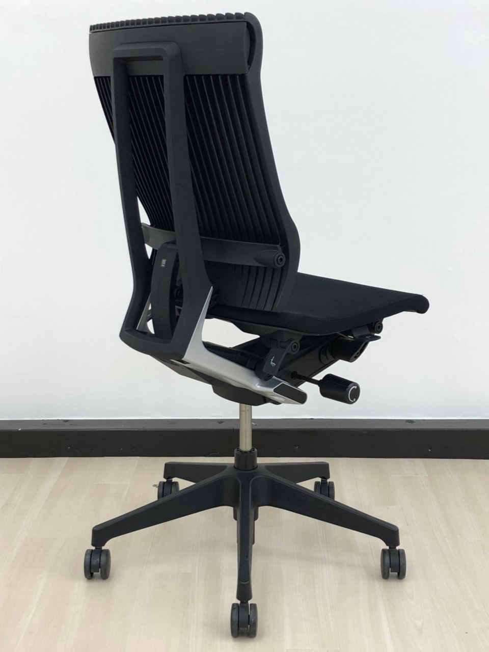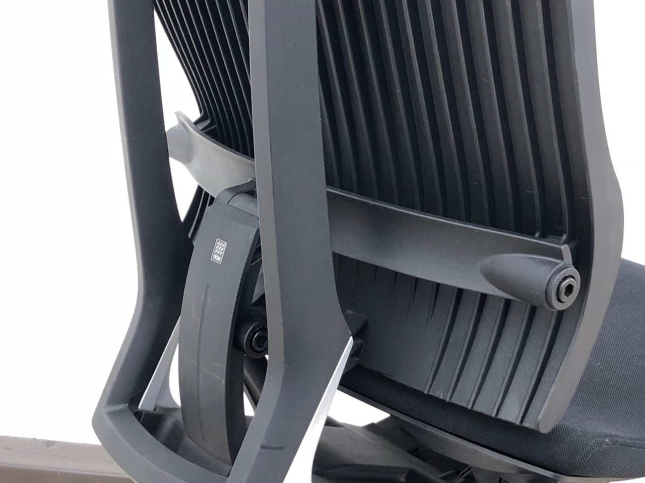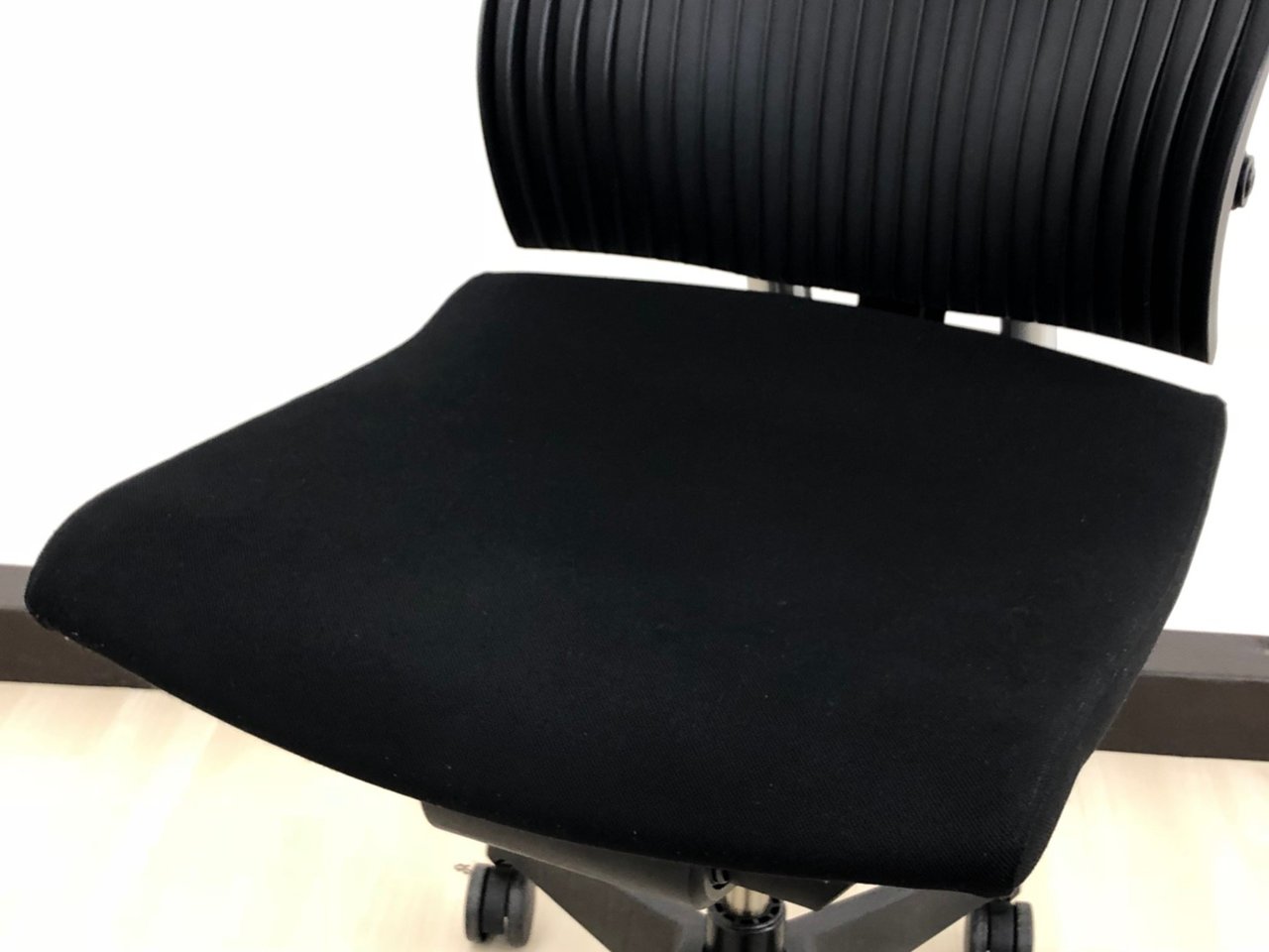 見た目は少し硬そうに見えるエラストマー素材ですが、座ってみると程よいしなり具合のやわらかな座り心地で、背中が痛くなるようなことはまるでありません。面ではなく線で支えることで、背面の通気性の良さは抜群です。