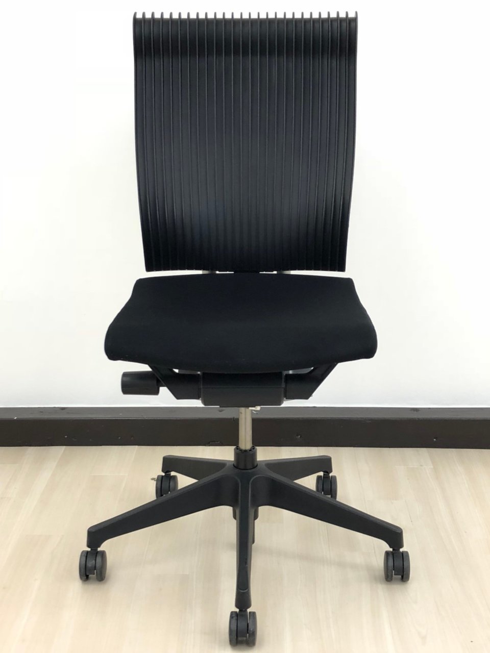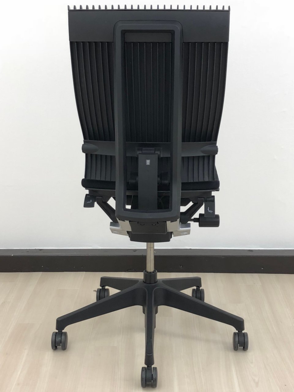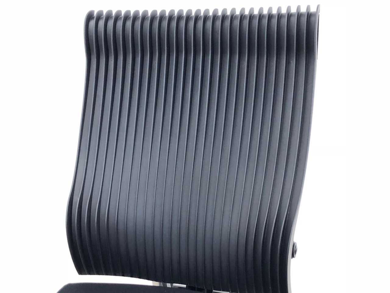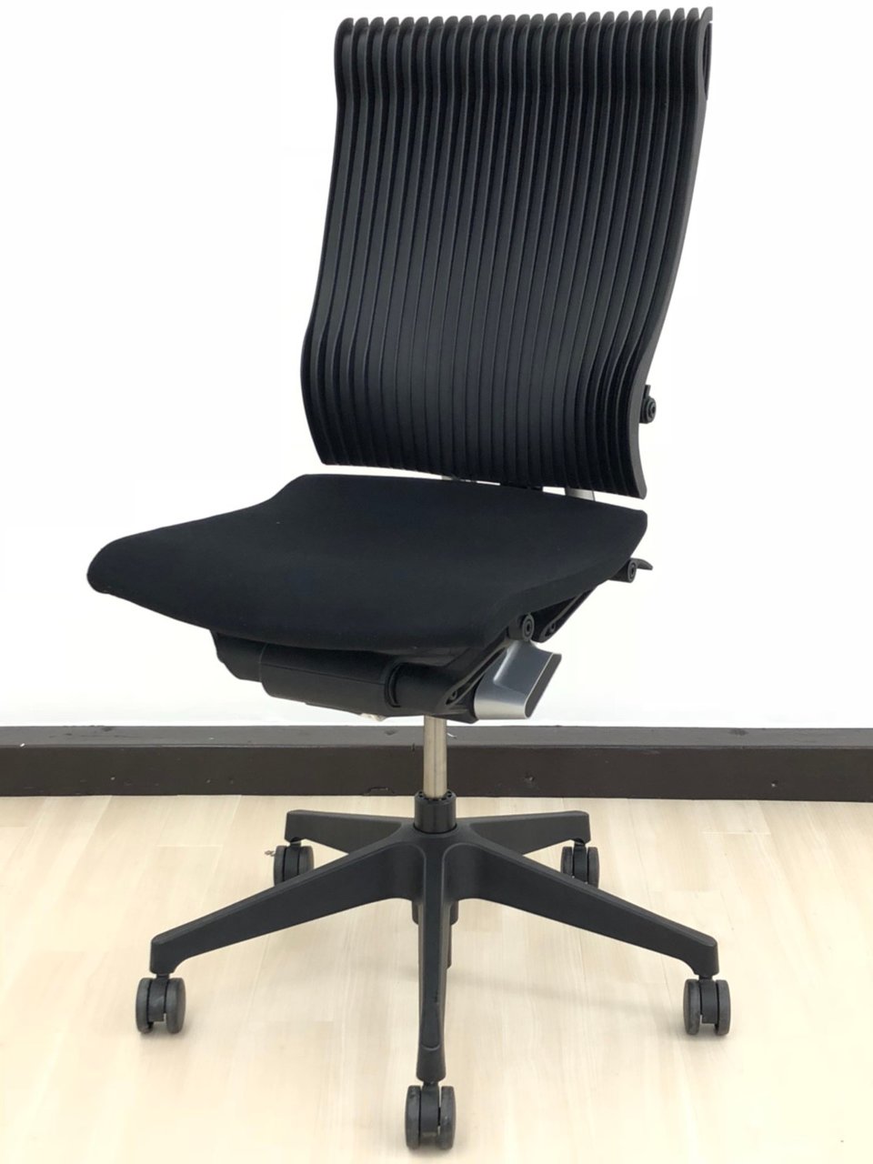 見た目は少し硬そうに見えるエラストマー素材ですが、座ってみると程よいしなり具合のやわらかな座り心地で、背中が痛くなるようなことはまるでありません。面ではなく線で支えることで、背面の通気性の良さは抜群です。