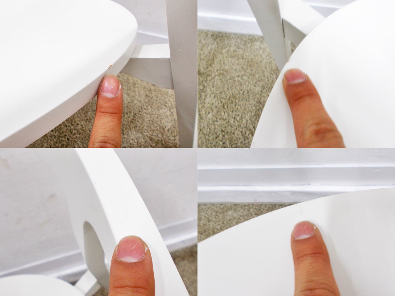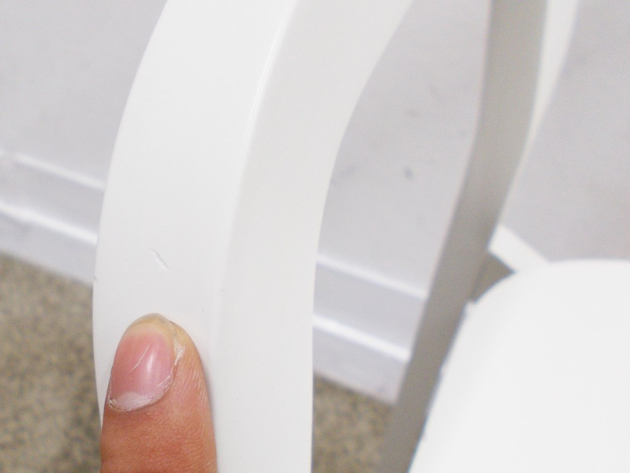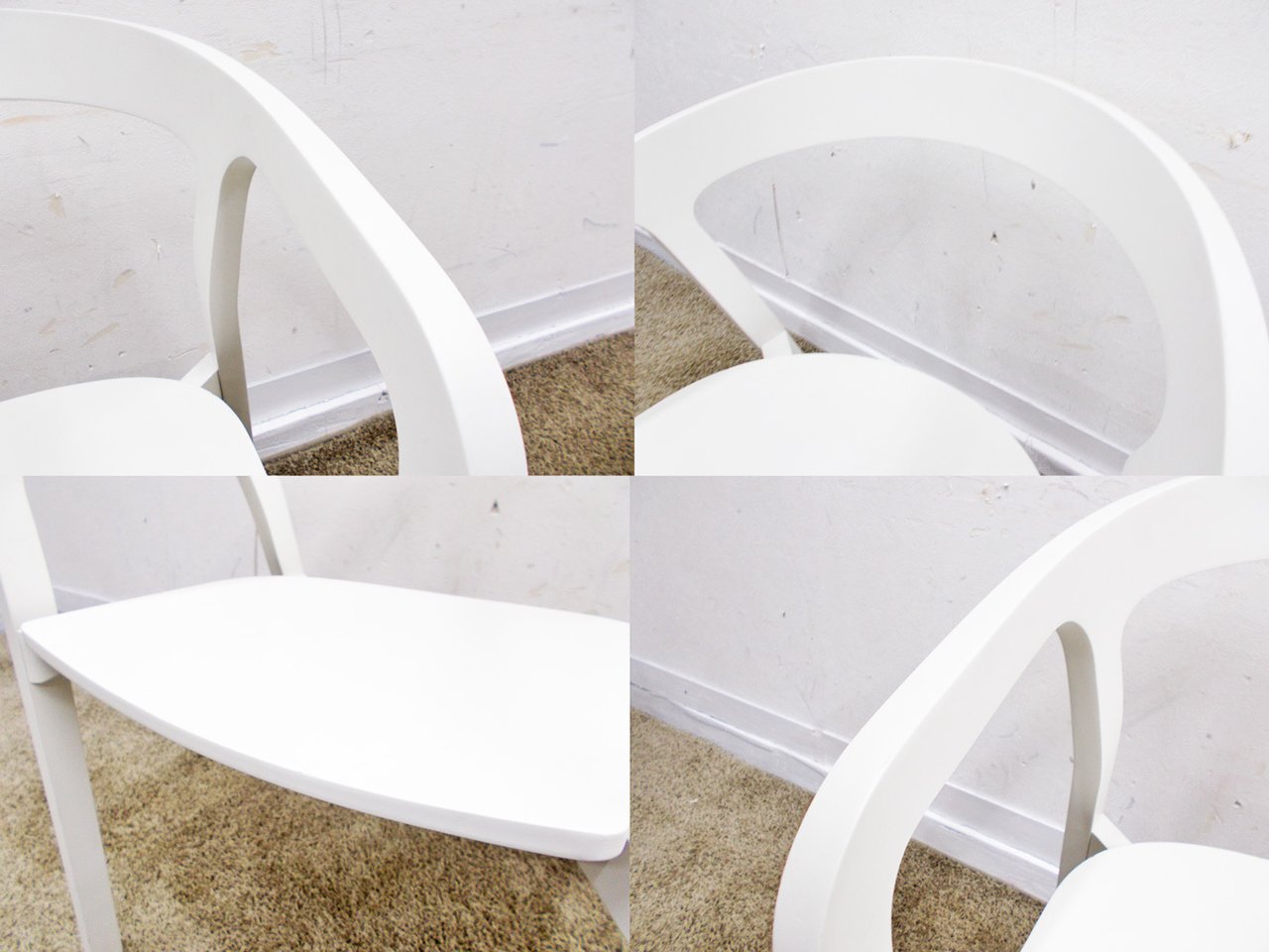 - かなり強い濃い黄ばみ・変色が商品全体にある。(例、座面・背もたれ、脚部等にある。)