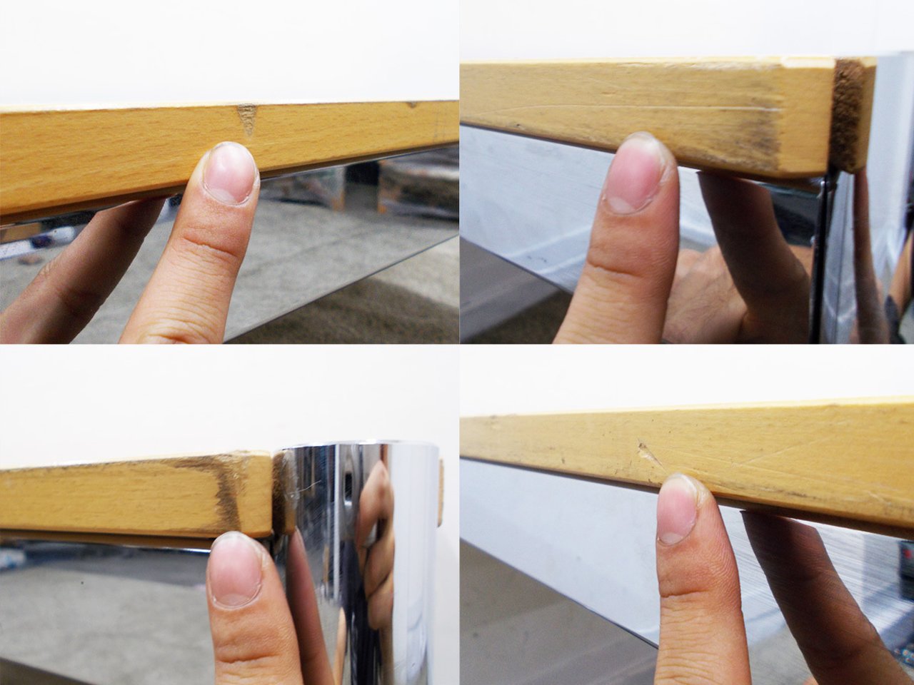 - 目立つ箇所あり傷・凹みが多数、深い傷・凹みが一部ある。(例、天板、幕板、棚板、サイド部分、脚部等にある。)