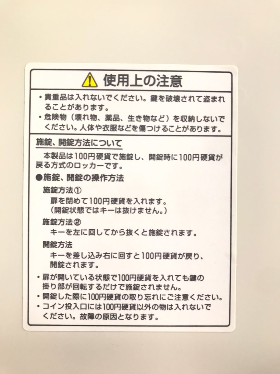 100円を入れてロッカーを使用しますが、使い終わると100円が返却されます。