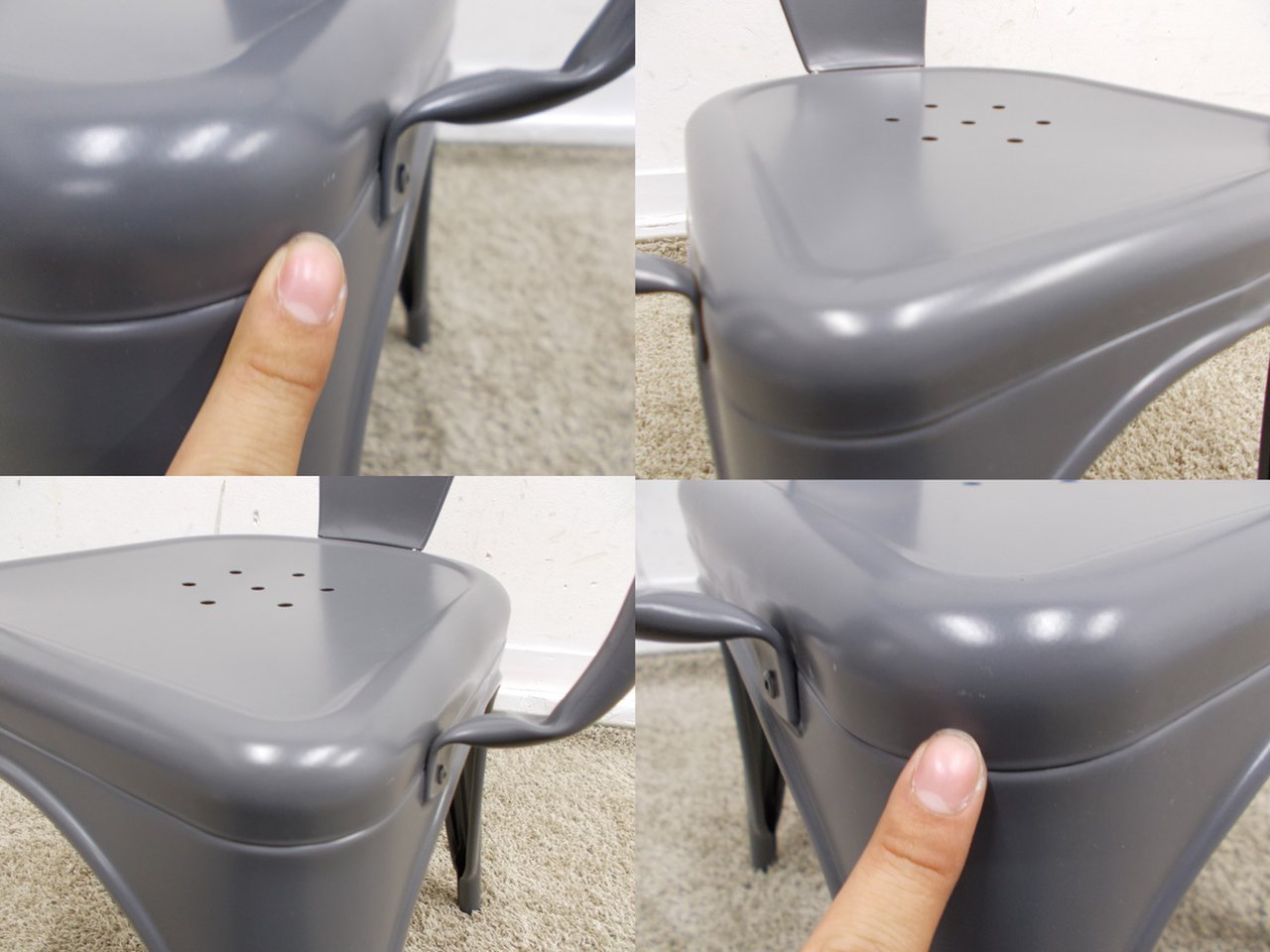 - 目立つ箇所あり傷・破れ・ほつれ・へたり・しわが多数または深い傷・破れ・ほつれ・へたり・しわが一部ある。※座面・背もたれ、シェル、脚部等にある。