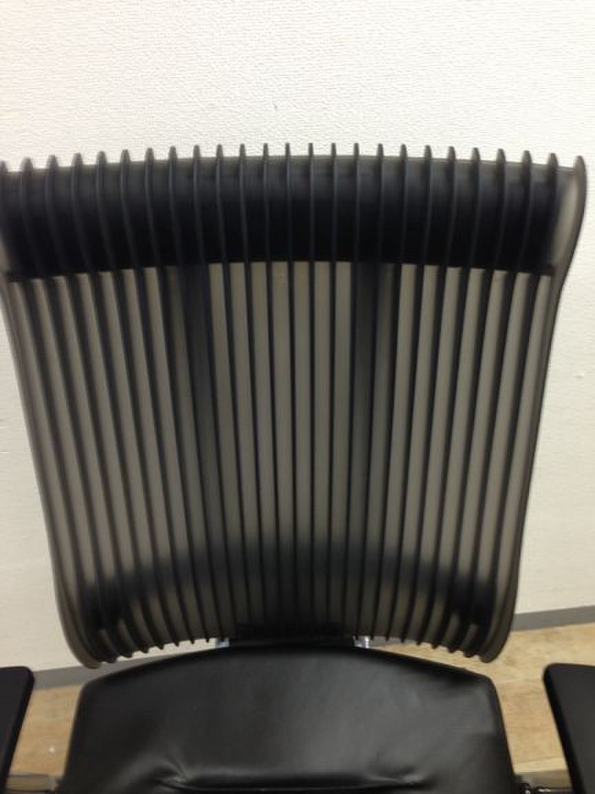 見た目は少し硬そうに見えるエラストマー素材ですが、座ってみると程よいしなり具合のやわらかな座り心地で、背中が痛くなるようなことはまるでありません。面ではなく線で支えることで、背面の通気性の良さは抜群です。