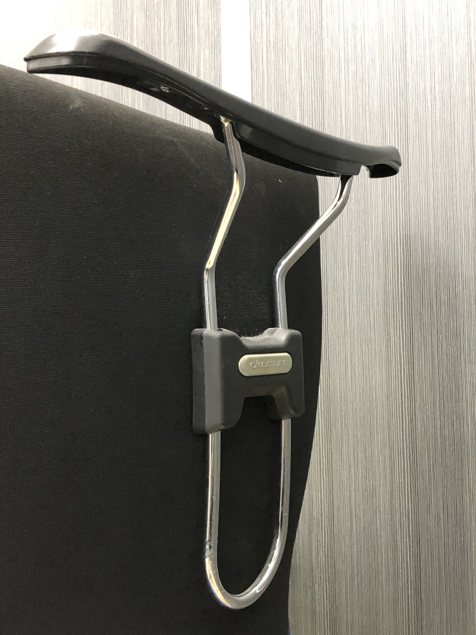 - 背もたれの裏側にハンガーがついているので上着などを形よく掛けられ、袖や裾が床に付きにくくなります。
