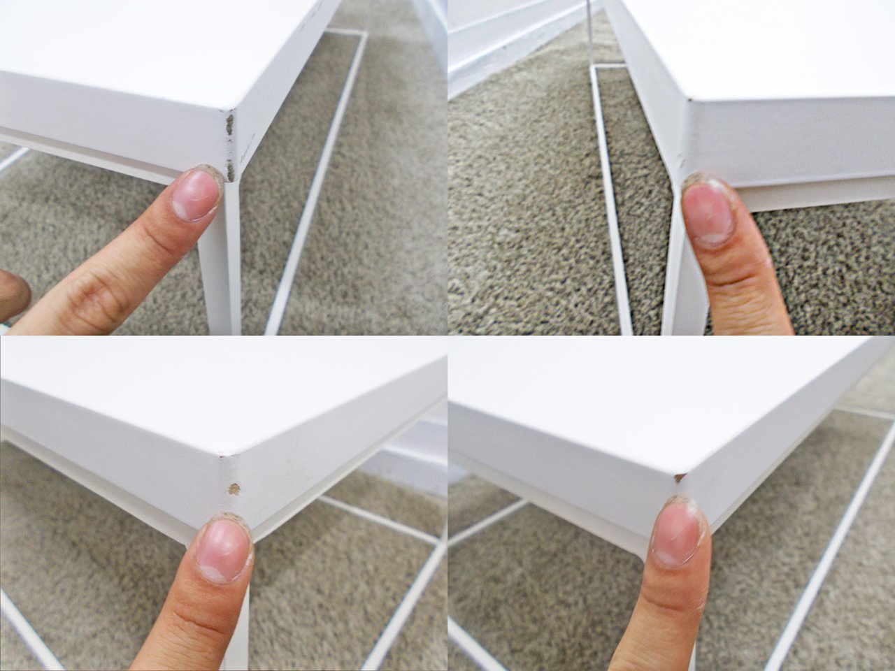 - 目立つ箇所複数ありソファの場合、深い破け、ホツレ、へたり、しわ等が多数ある。(例、背もたれ、肘かけ、座面等にある。)センターテーブルの場合、深い傷・凹みが商>品全体にある。(例、天板、脚にある。)