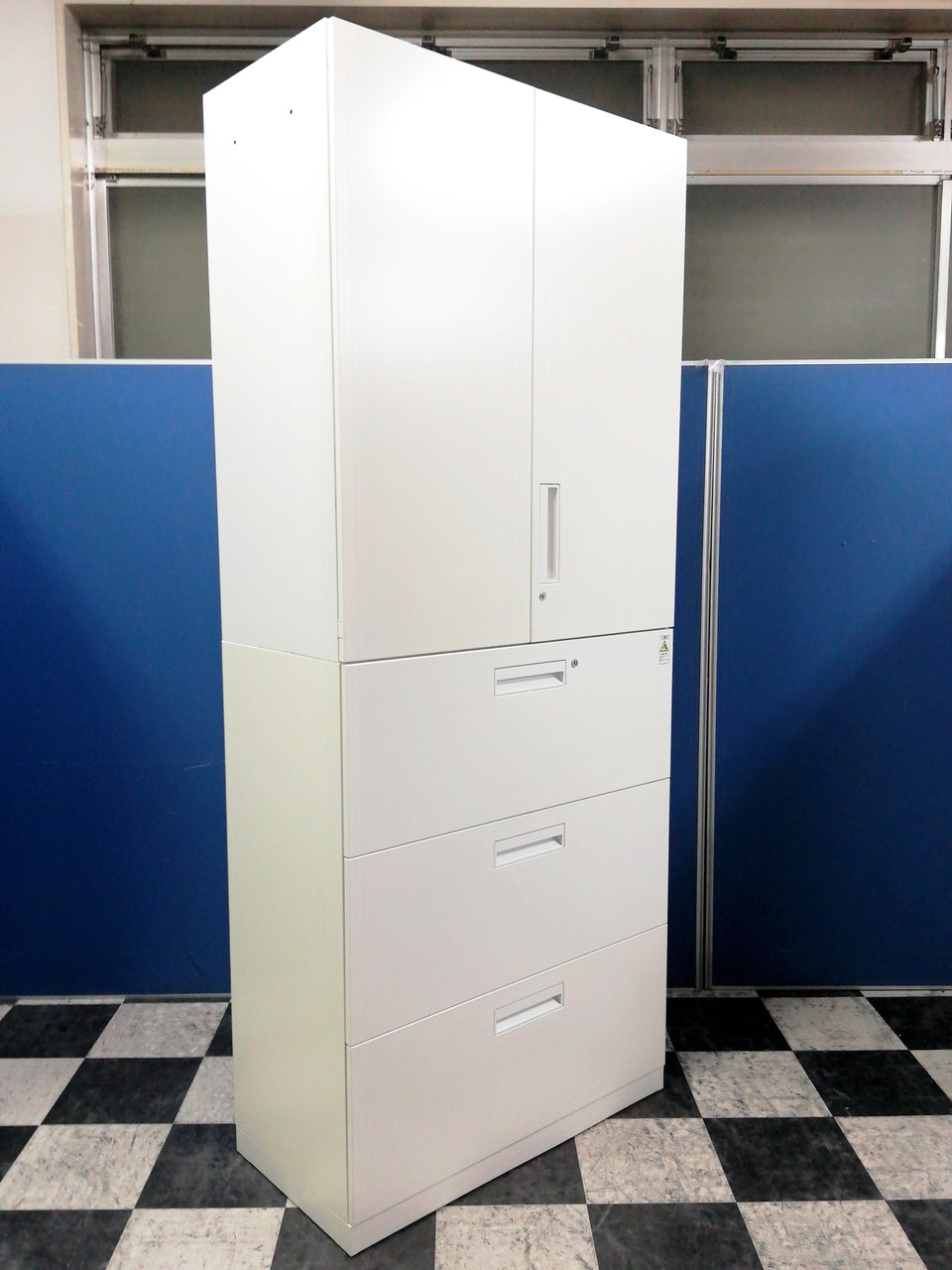 【オフィスの書類をまとめて整理!引き違いと引き出し式の書庫セット!】■コクヨ(KOKUYO)製 エディア(EDIA) 引き違い+3段ラテラル 上下書庫セット 2枚扉 H2150㎜ ■シリンダー錠 ■ホワイト