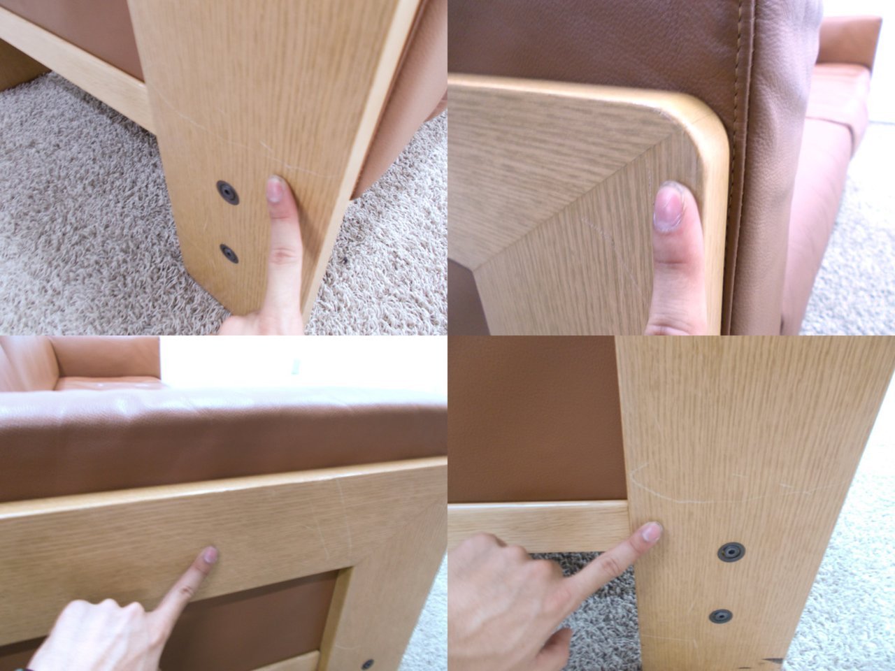 - 若干あり黄ばみ・変色が一部ある。(例:三人用ソファ、二人用ソファ、一人用ソファの場合、背もたれ、肘かけ、座面等、センターテーブルの場合、天板、脚にある。)