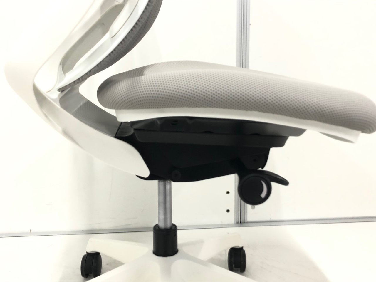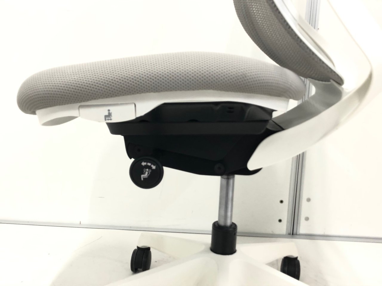 - 座面左下のダイヤルでリクライニングの固定と解除が行えます。 前傾ポジションをとることも可能です。