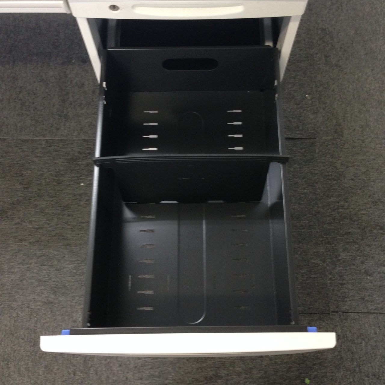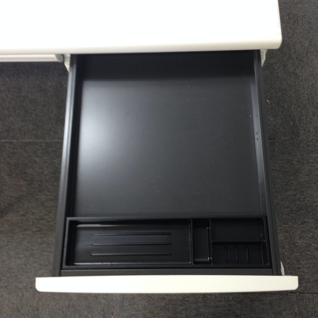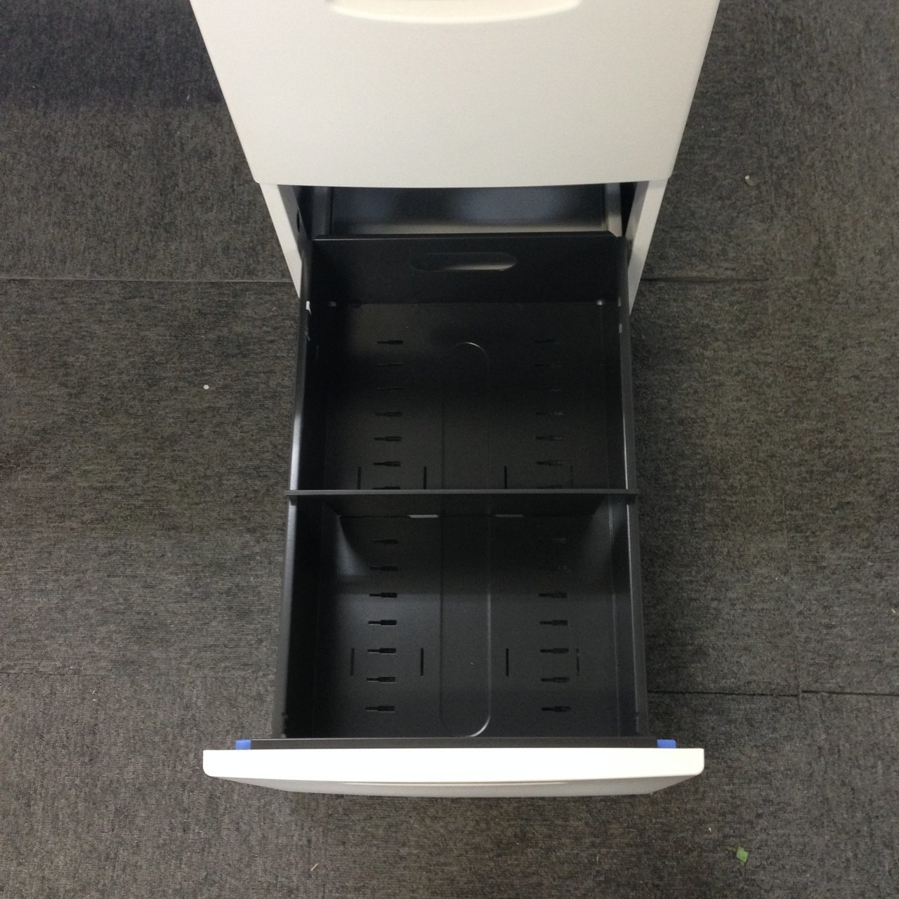 - 袖机のワゴンは、最下段がロング引出しになっており、従来より収納力120%アップ。