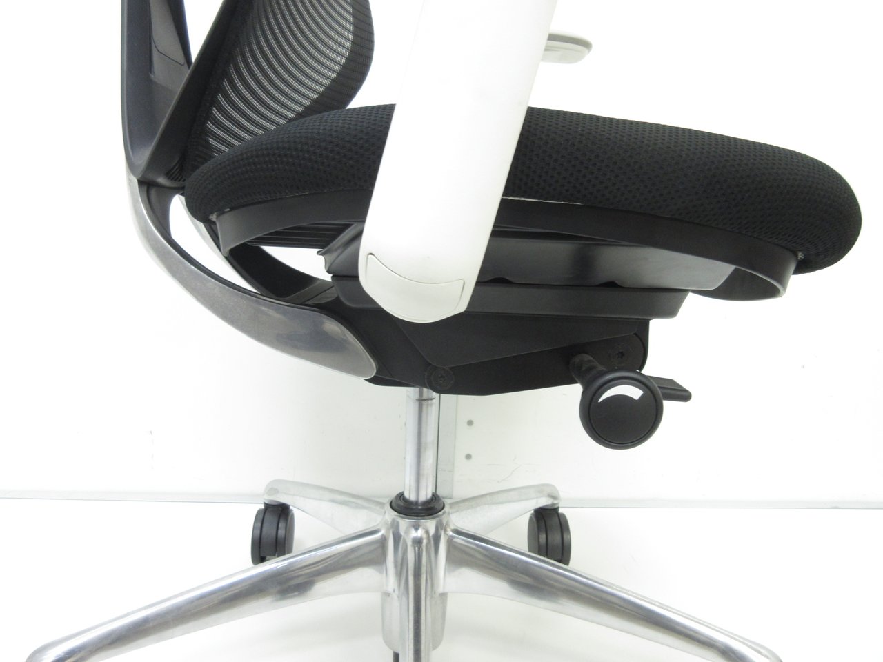 - 椅子と背が連動する「シンクロリクライニング」。リクライニング角度は直立ポジションから前方に10度、後方に23度です。