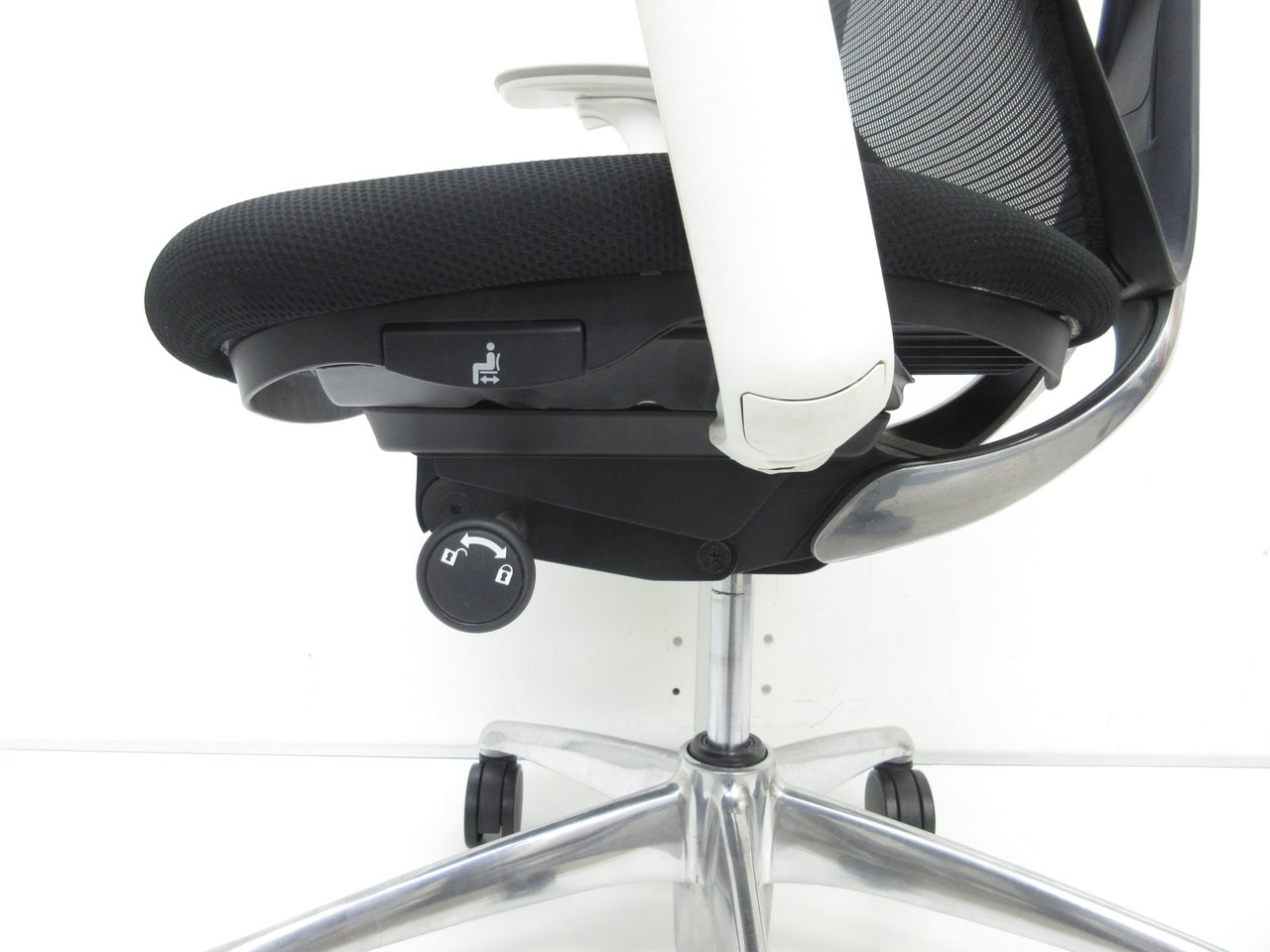 - 座面右下のレバーをスライドさせる「クイックスライドオペレーション」で、リクライニング反力を調整できます。強さの状態が視覚的にわかるため、直感的に操作がおこなえます。