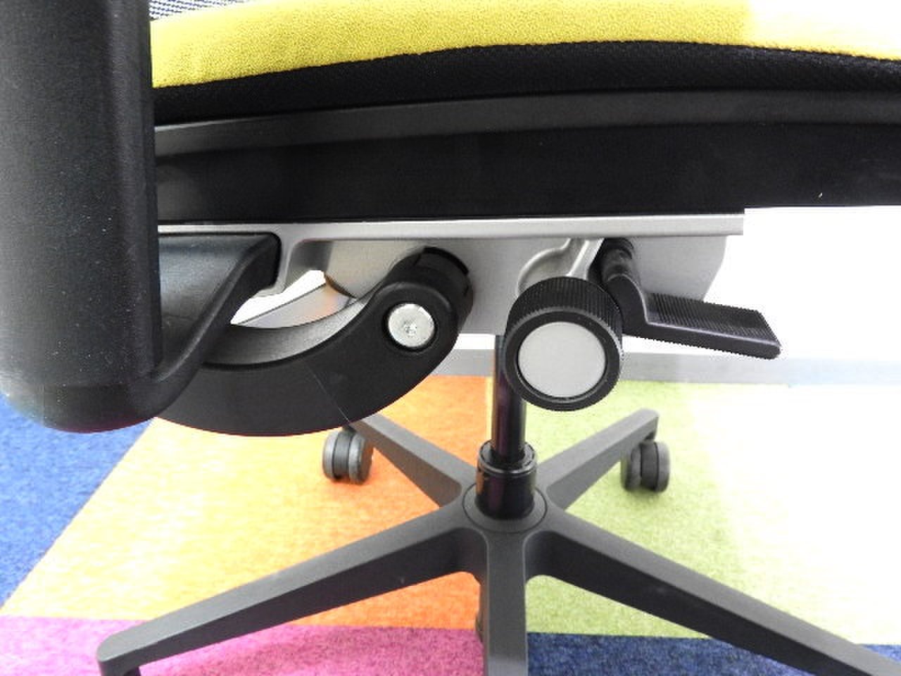 - レバーを引き上げながら座面を前後にスライドさせ、レバーを放すとロックします。背もたれに身体をつけた状態で膝の裏側と座面のエッジの間に5-8センチほどの隙間ができるのが理想的です。