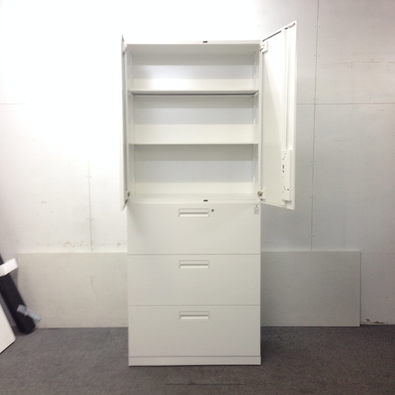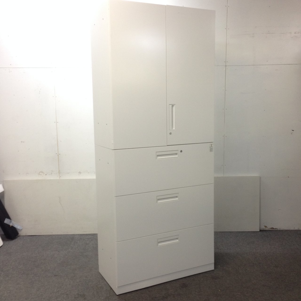 【オフィスの書類をまとめて整理!引き違いと引き出し式の書庫セット!】■コクヨ(KOKUYO)製 エディア(EDIA) 引き違い+3段ラテラル 上下書庫セット 2枚扉 H2150㎜ ■シリンダー錠 ■ホワイト
