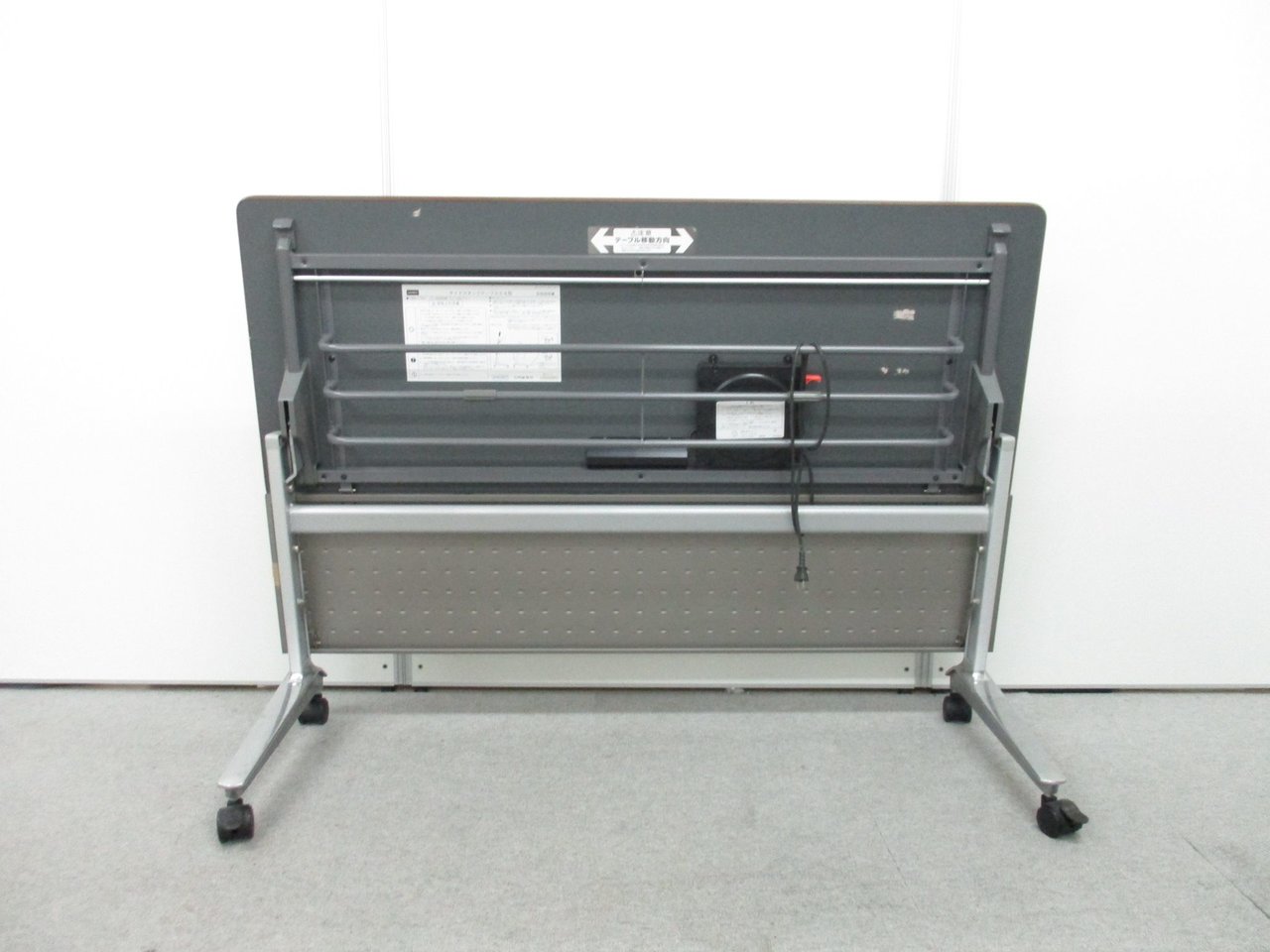 - 一部不具合あり天板歪み、アジャスター無し、キャスター使用不可ようなそのテーブルの本来の効用を果たすための機能以外の一部が使用不可な状態。(例、キャスターロッ ク機能使用不可、棚板無し等がある。)