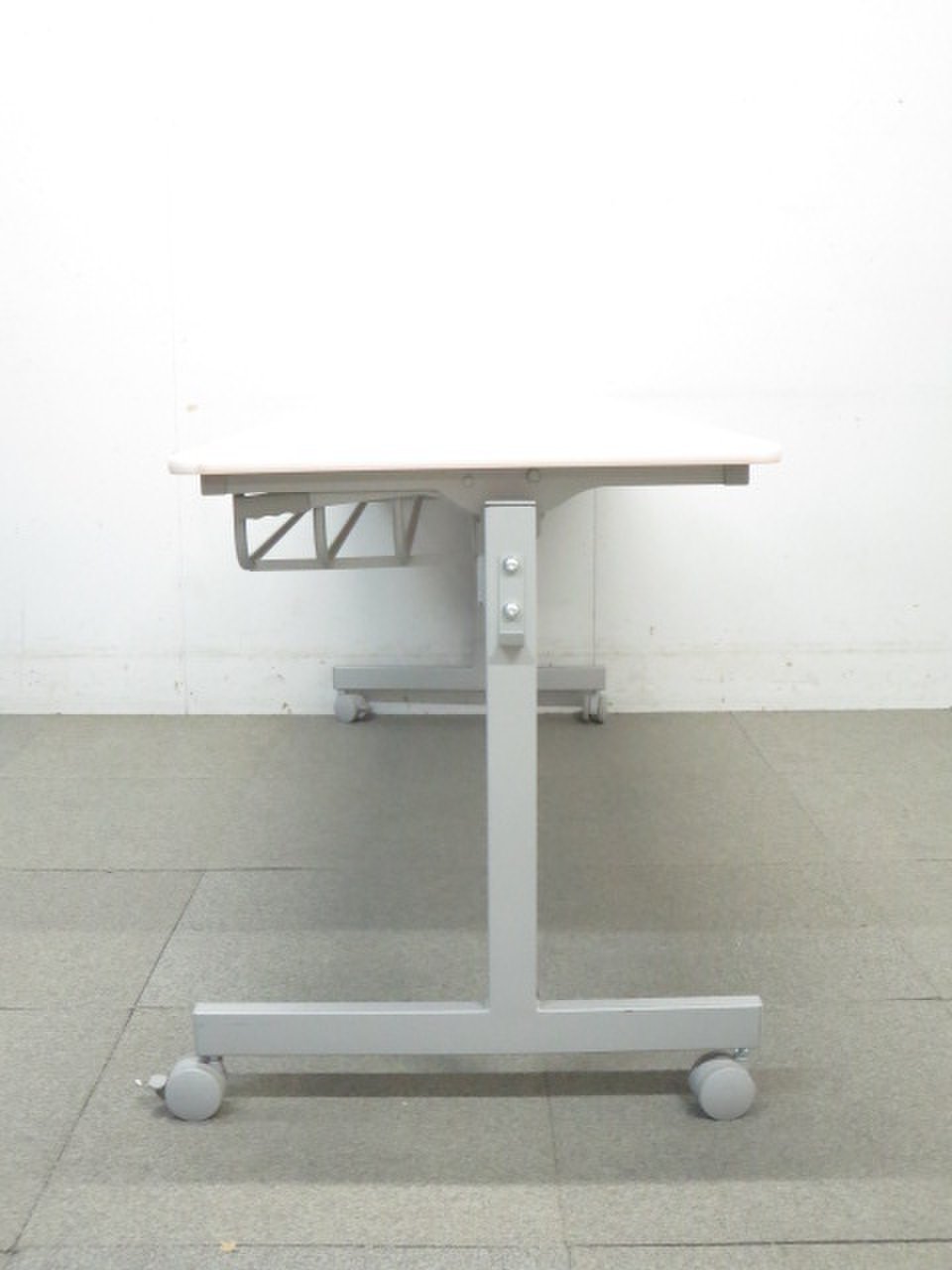 天板を跳ね上げることで重ねて収納できる、オフィスや施設で定番のスタッキング式の会議テーブルです。