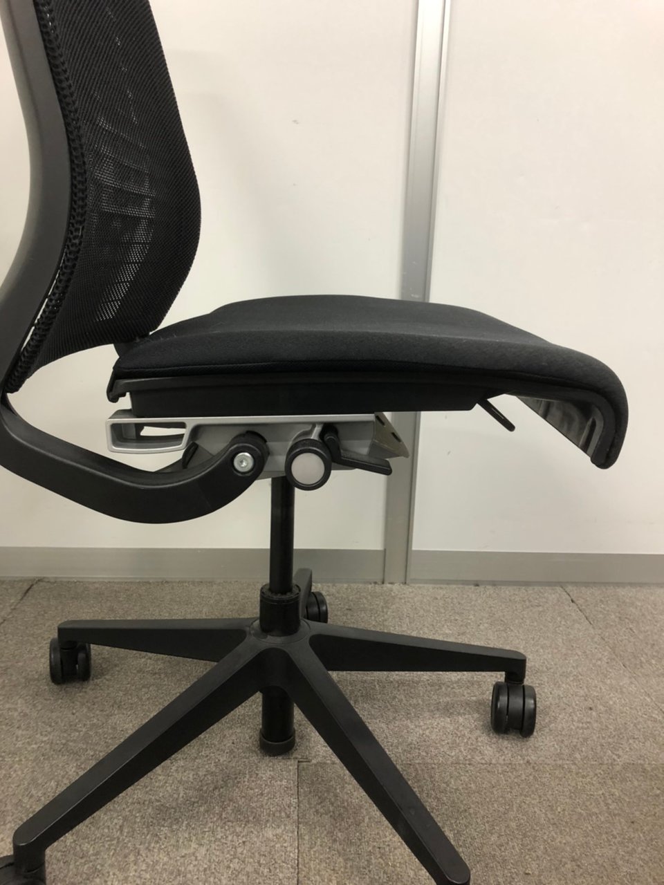 快適な座り心地に不可欠な調節機能である、上下昇降、座面の奥行き調整、リクライニングなどを備えており、操作もわかりやすく好評です。 特に、座面の奥行きは、座面下の左右に通った細いバーで調整でき、座ったままで軽やかに滑るように調整が可能です。 価格面では、新品では高めですが、中古は流通も多く、定価の3割前後の価格で高級チェアの座り心地を手に入れることができます!