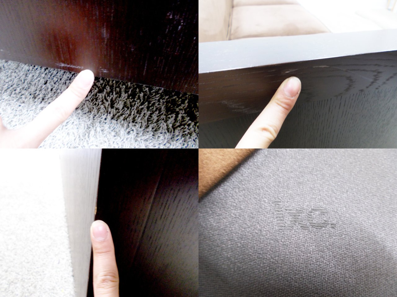 - 若干ありソファの場合、破け、ホツレ、へたり、しわ等が一部ある。(例、背もたれ、肘かけ、座面等にある。)センターテーブルの場合、傷・凹みが一部ある。(例、天板、 脚にある。)