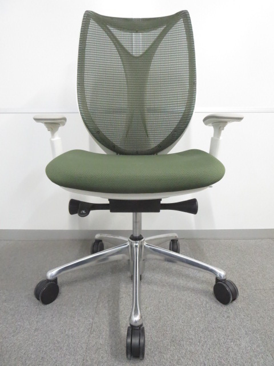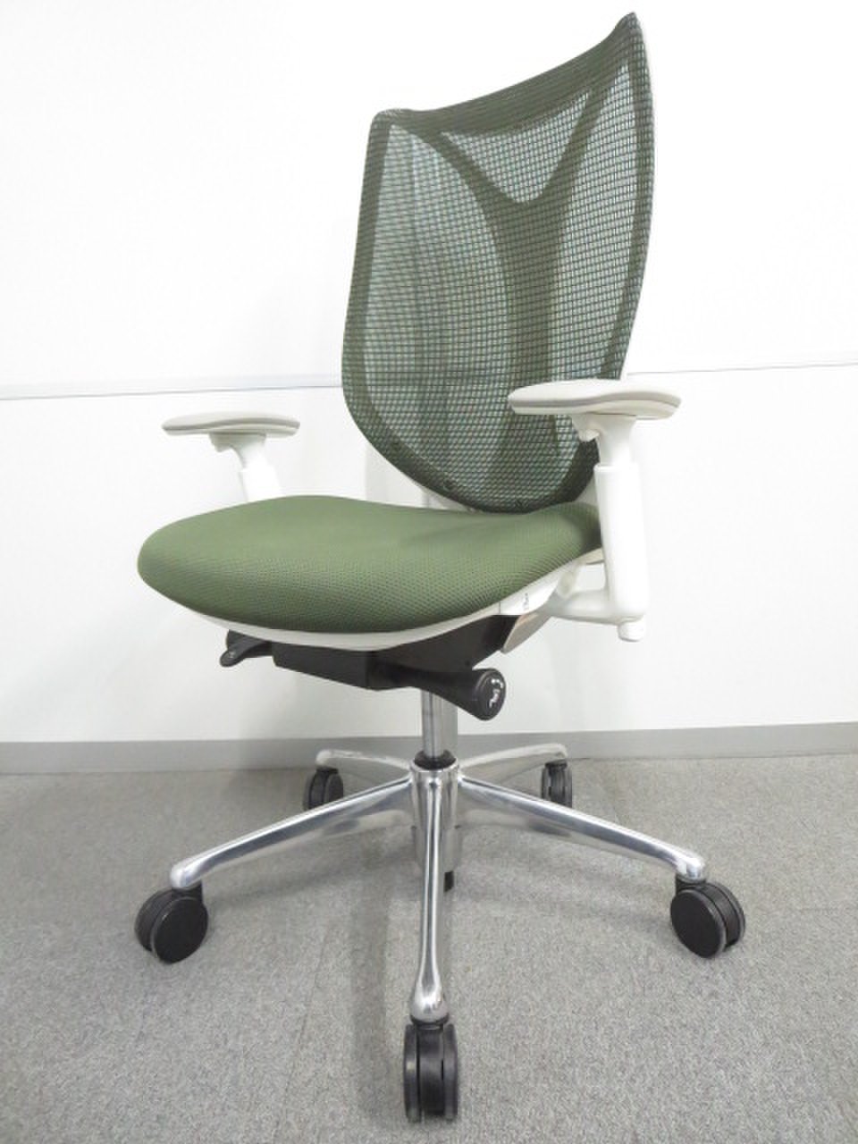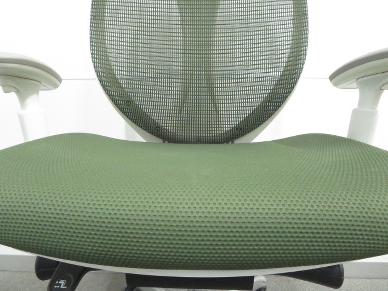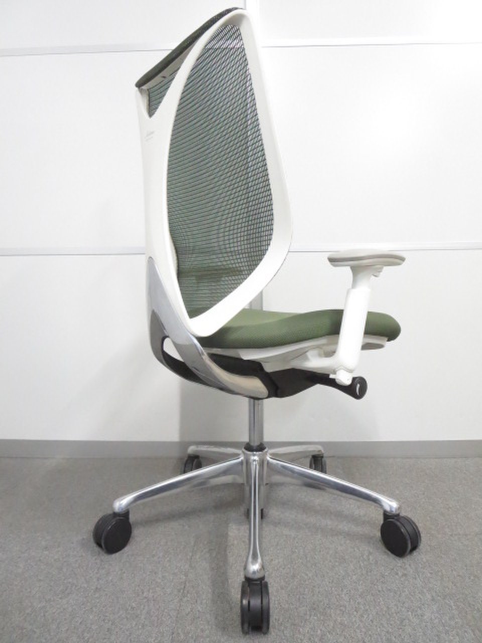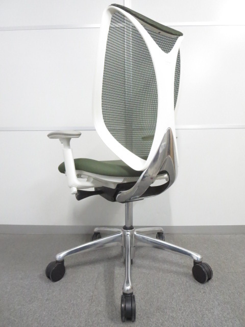 【美しい曲線&透明感のあるメッシュ】■オカムラ製 サブリナチェア ダークグリーン アジャストアーム付 ホワイトボディ- 川崎店
