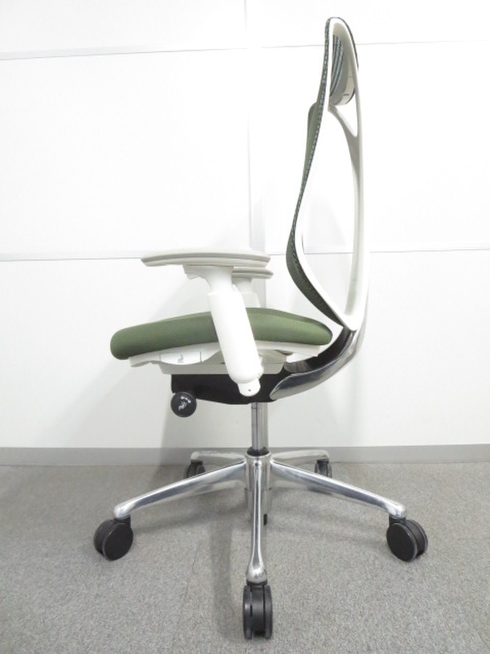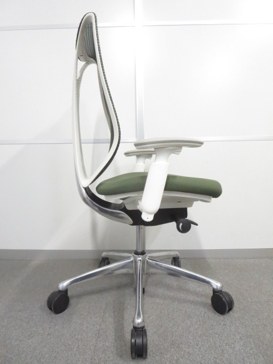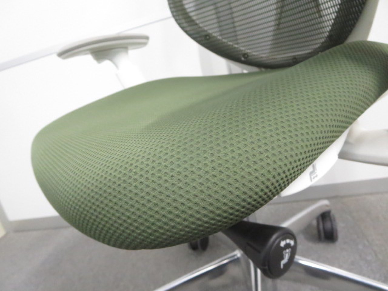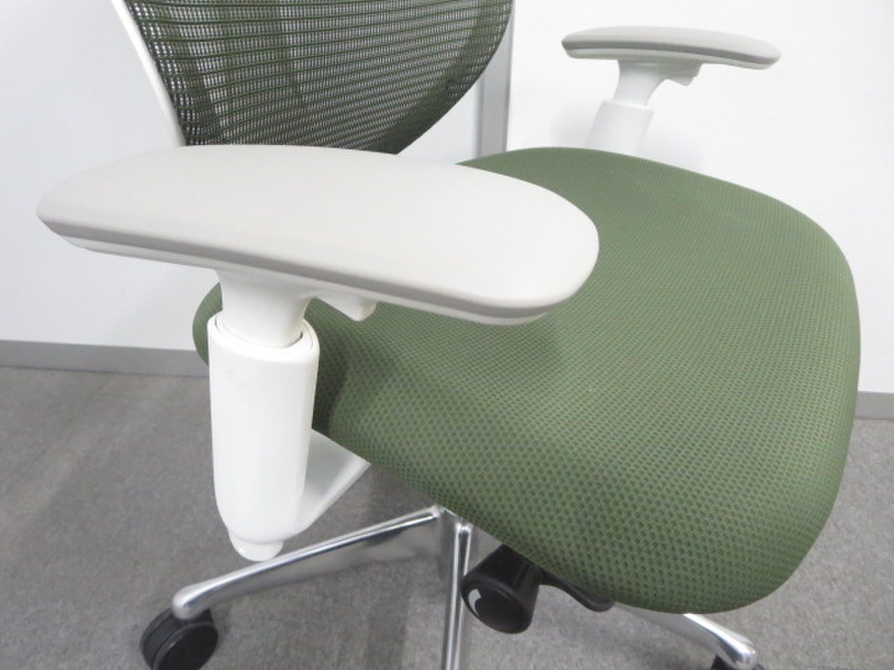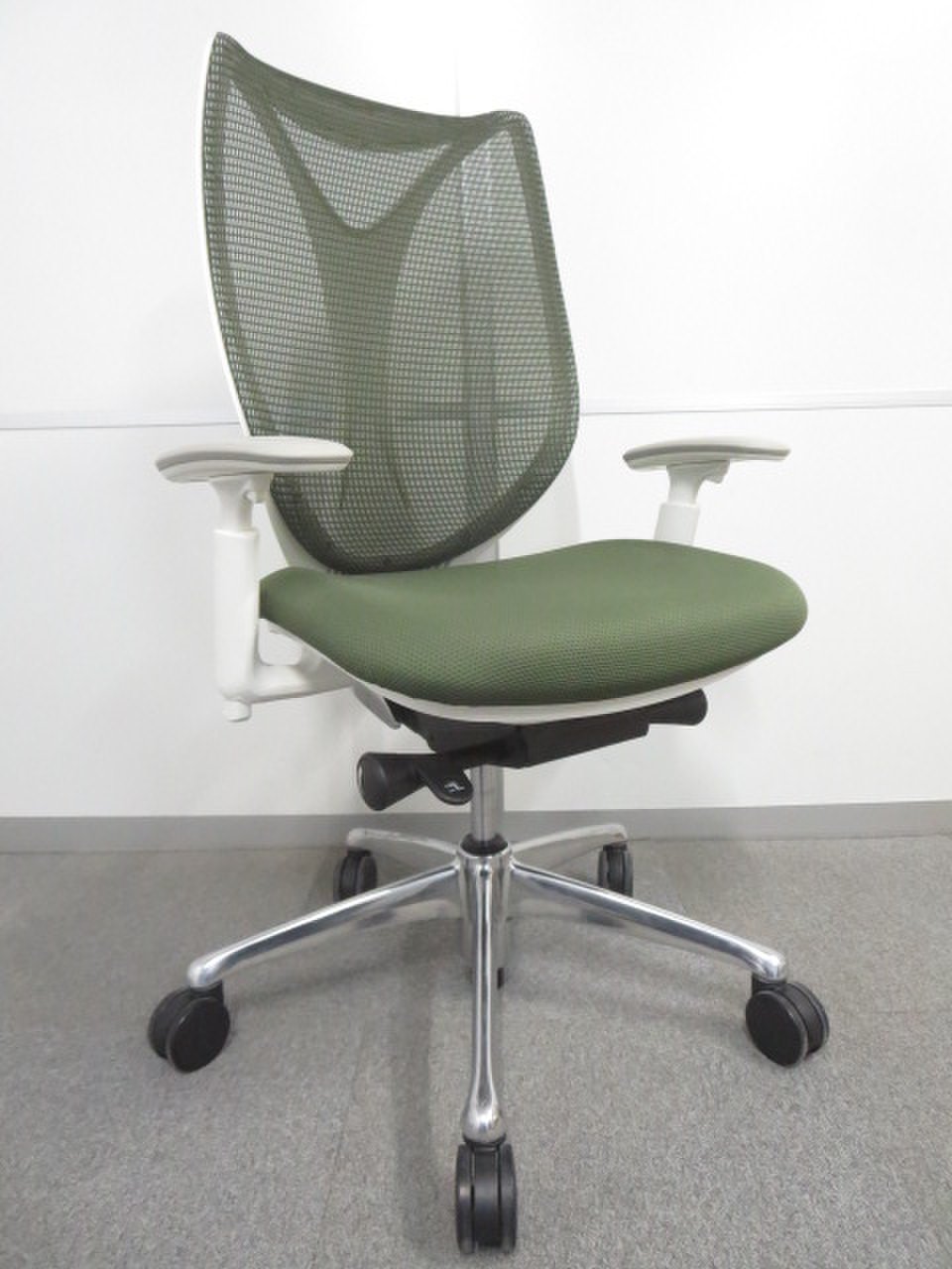 【美しい曲線&透明感のあるメッシュ】■オカムラ製 サブリナチェア ダークグリーン アジャストアーム付 ホワイトボディ- 川崎店