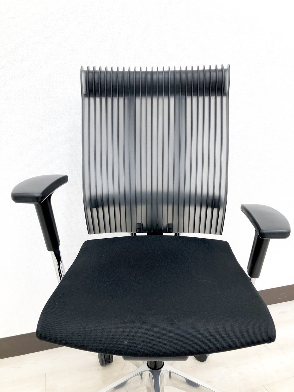見た目は少し硬そうに見えるエラストマー素材ですが、座ってみると程よいしなり具合のやわらかな座り心地で、背中が痛くなるようなことはまるでありません。面ではなく線で支えることで、背面の通気性の良さは抜群です。