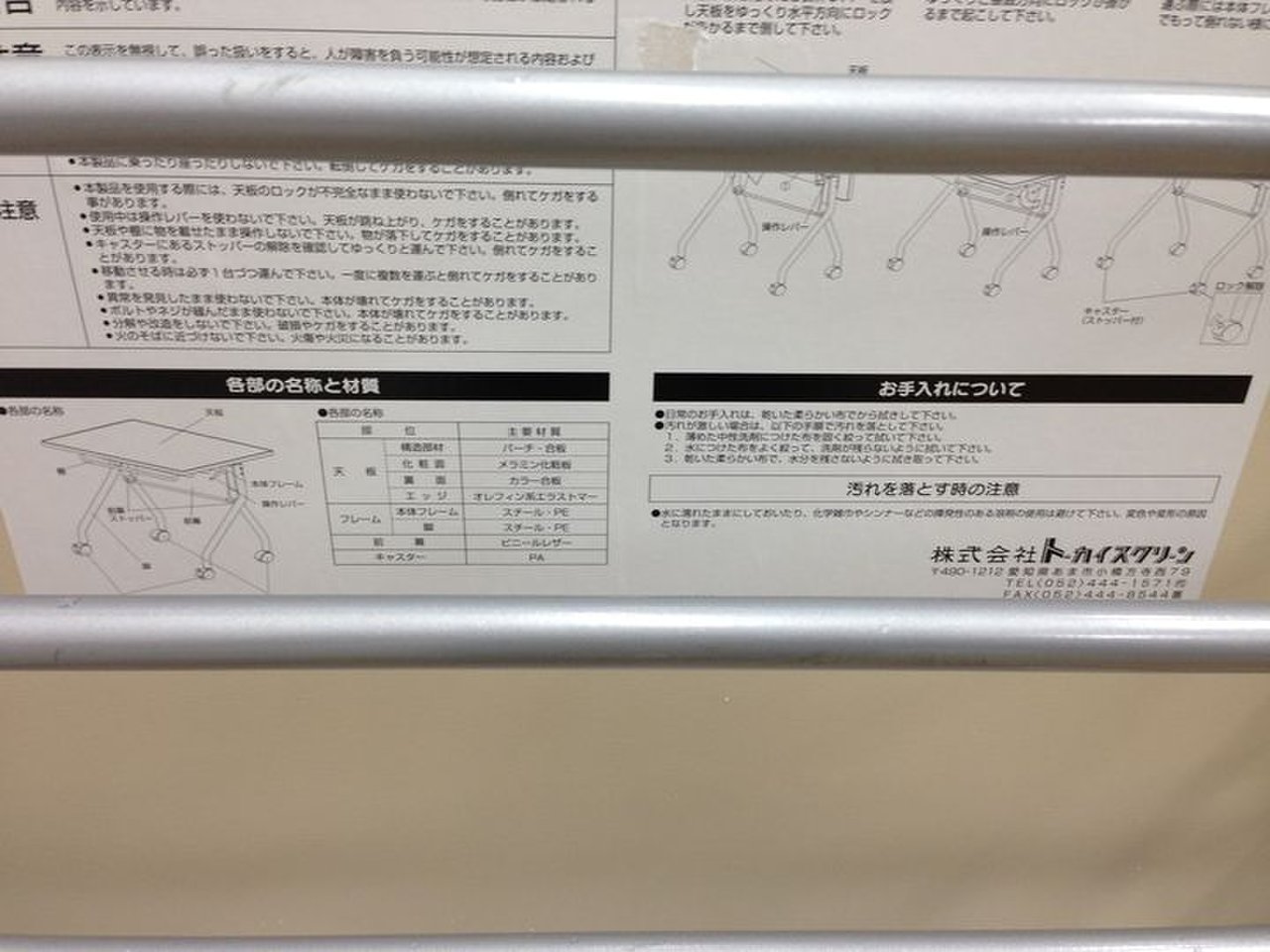 - 一部不具合あり天板歪み、アジャスター無し、キャスター使用不可ようなそのテーブルの本来の効用を果たすための機能以外の一部が使用不可な状態。(例、キャスターロッ ク機能使用不可、棚板無し等がある。)