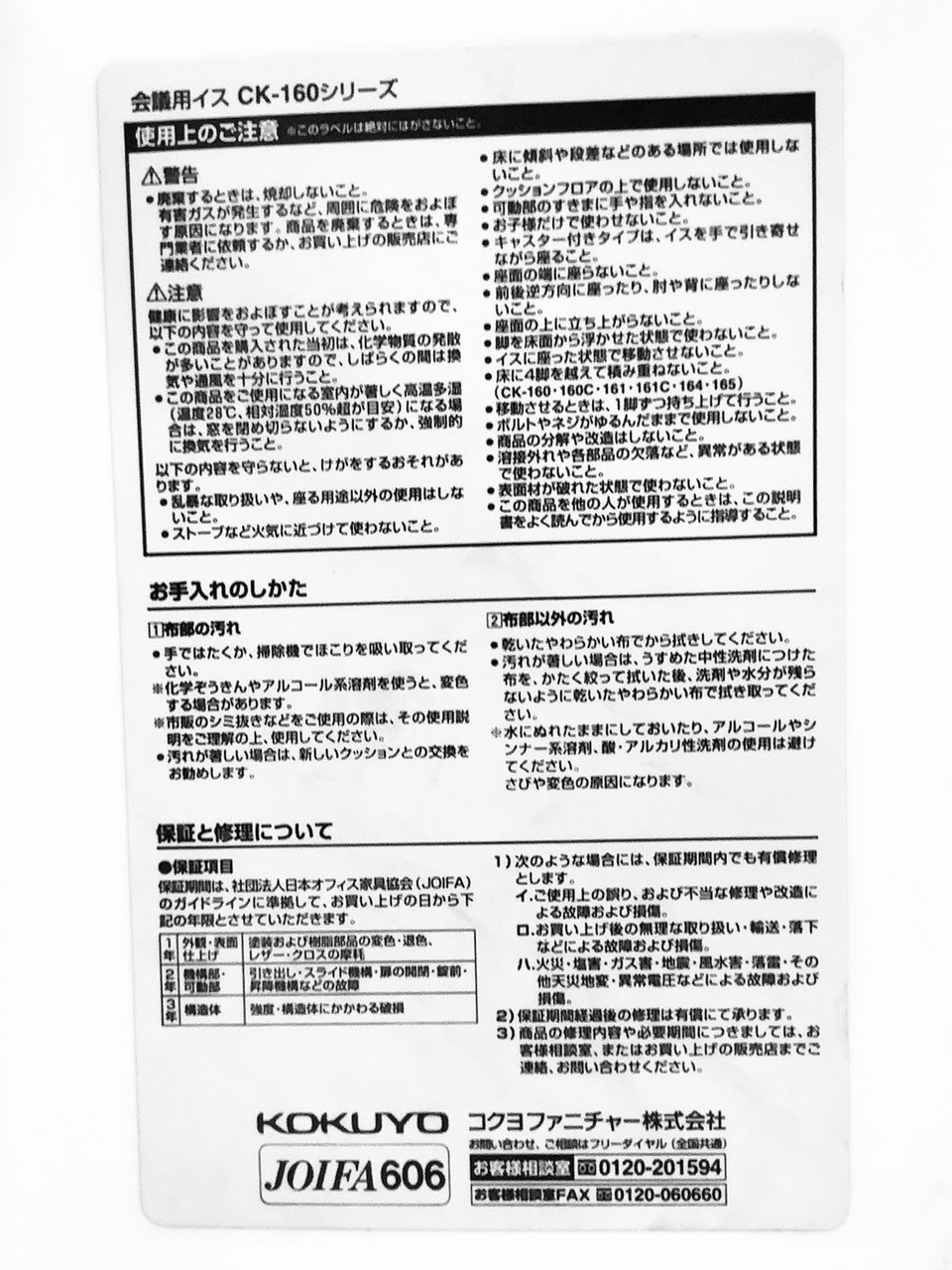 - 不具合多数そのチェアの本来の効用を果たすための機能に不具合ある。(例、オフィスチェアの上下昇降キャスター付きミーティングチェアのキャスター使用不可のような不 具合)