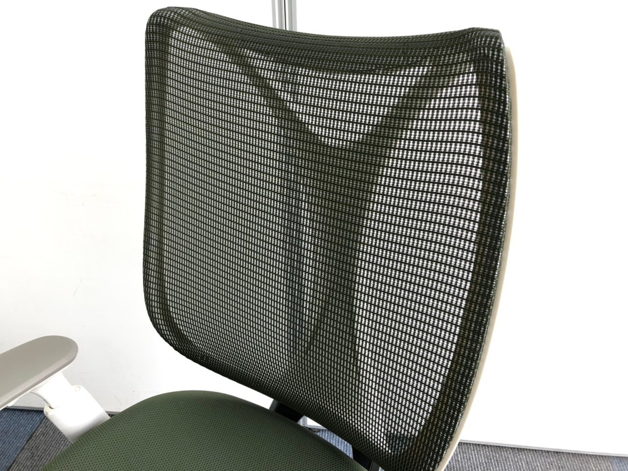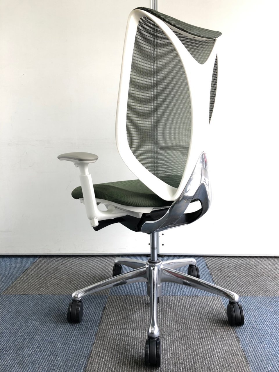 【美しい曲線&透明感のあるメッシュ】■オカムラ製 サブリナチェア ダークグリーン アジャストアーム付 ホワイトボディ ハンガー付【※外部倉庫在庫品(店頭在庫無)】【BR】