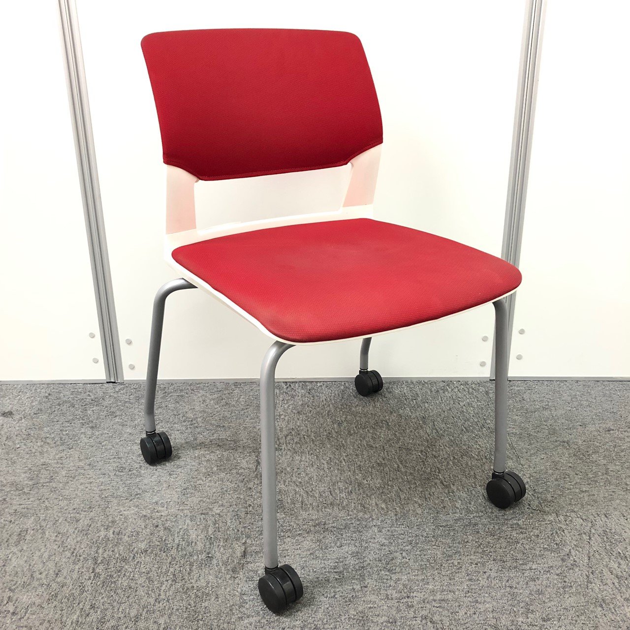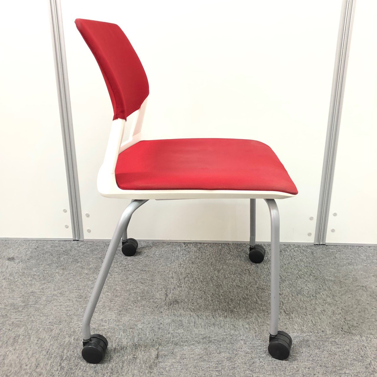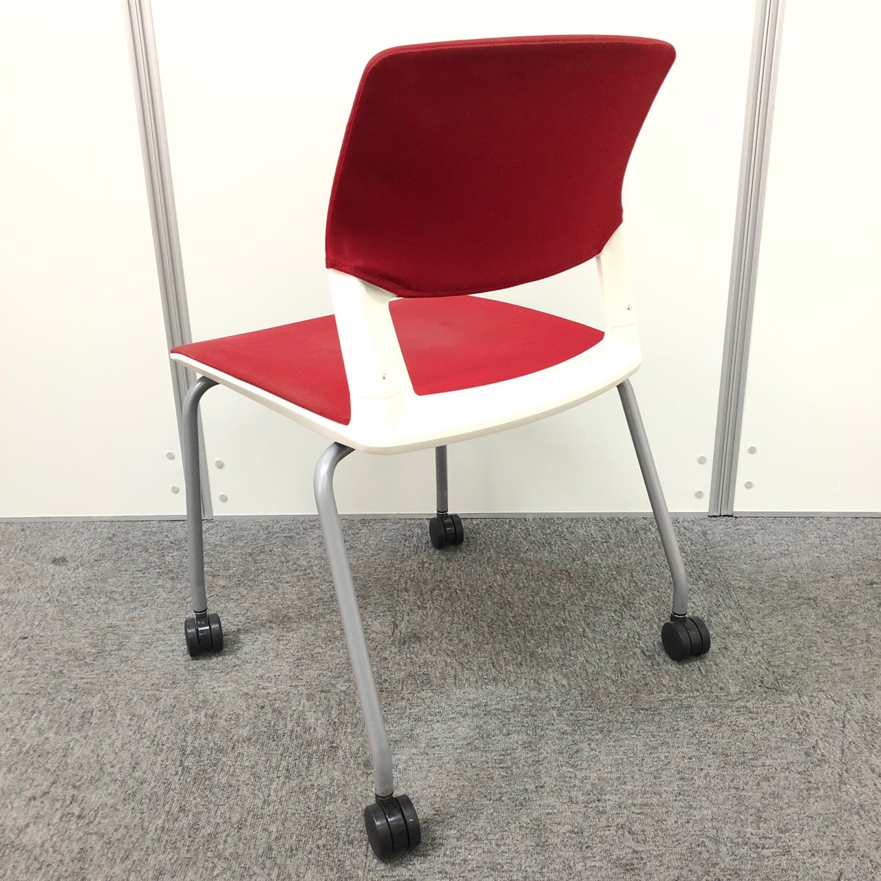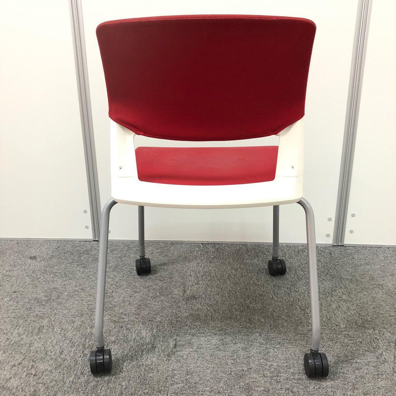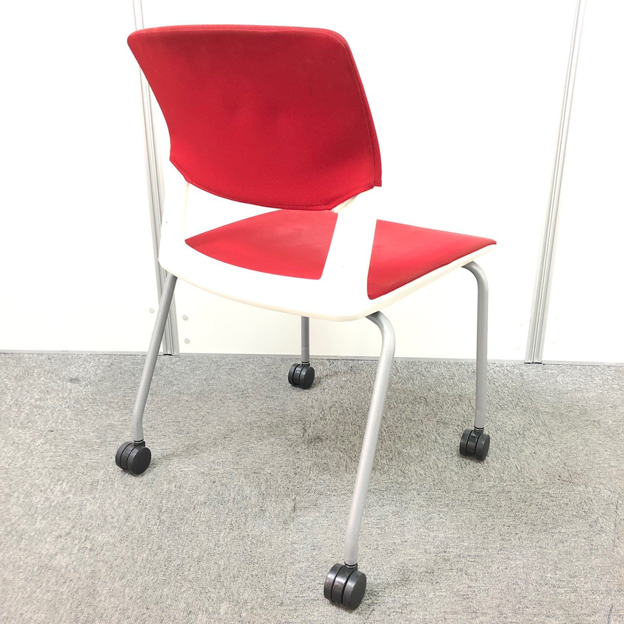 【しっかりクッションで座りやすい!】■コクヨ製 スタッキングチェア 座:レッド 背:ホワイト ■フローリングでも使いやすい!ゴムキャスタータイプ!