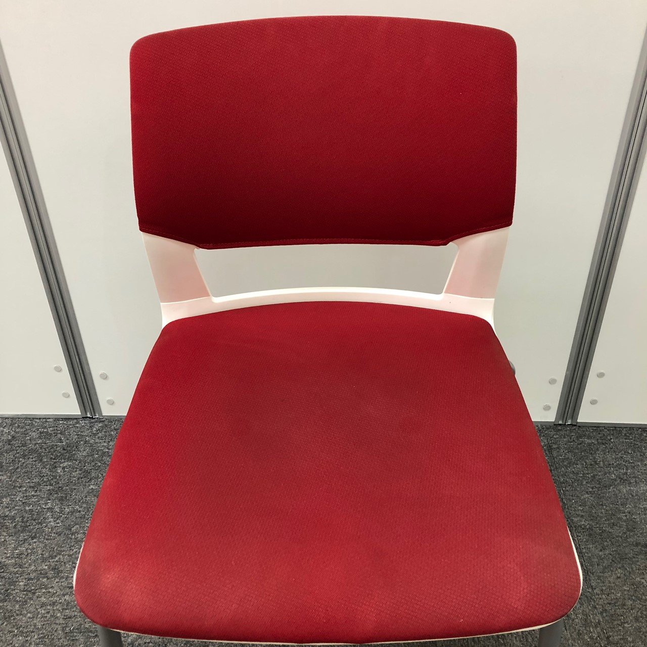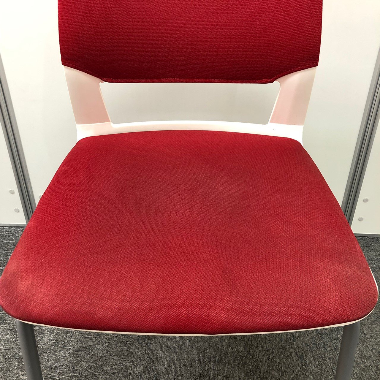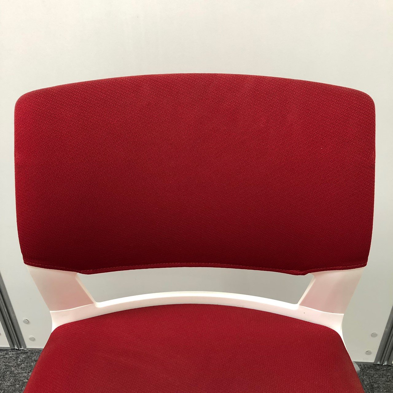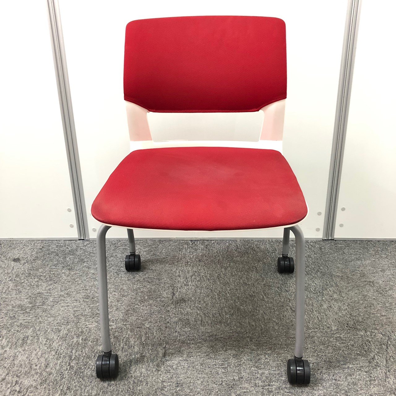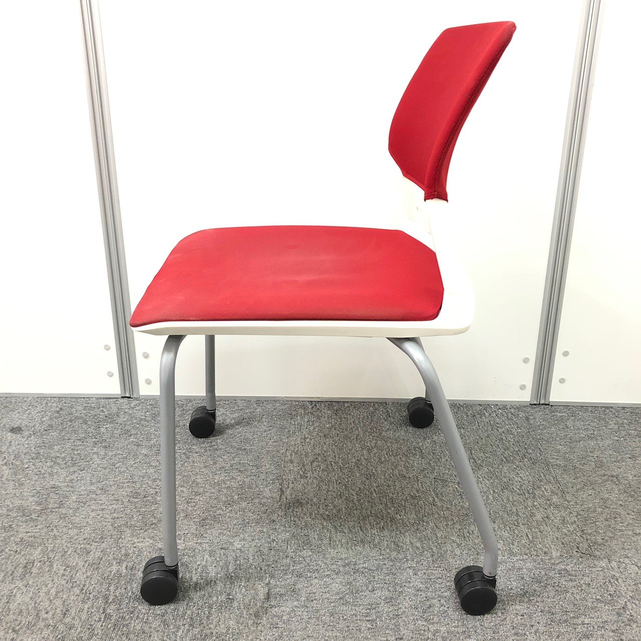 【しっかりクッションで座りやすい!】■コクヨ製 スタッキングチェア 座:レッド 背:ホワイト ■フローリングでも使いやすい!ゴムキャスタータイプ!
