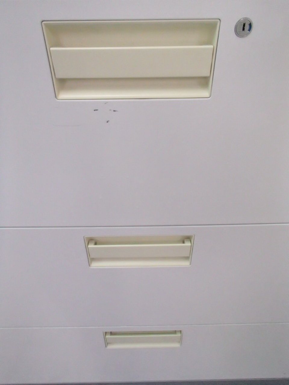 - 多数不具合あり引出の開閉不可、施錠不可、棚板無しといったその書庫の本来の効用を果たすための機能以外の多数が使用不可(例、扉、引出の開閉がしづらいなどがある。 )