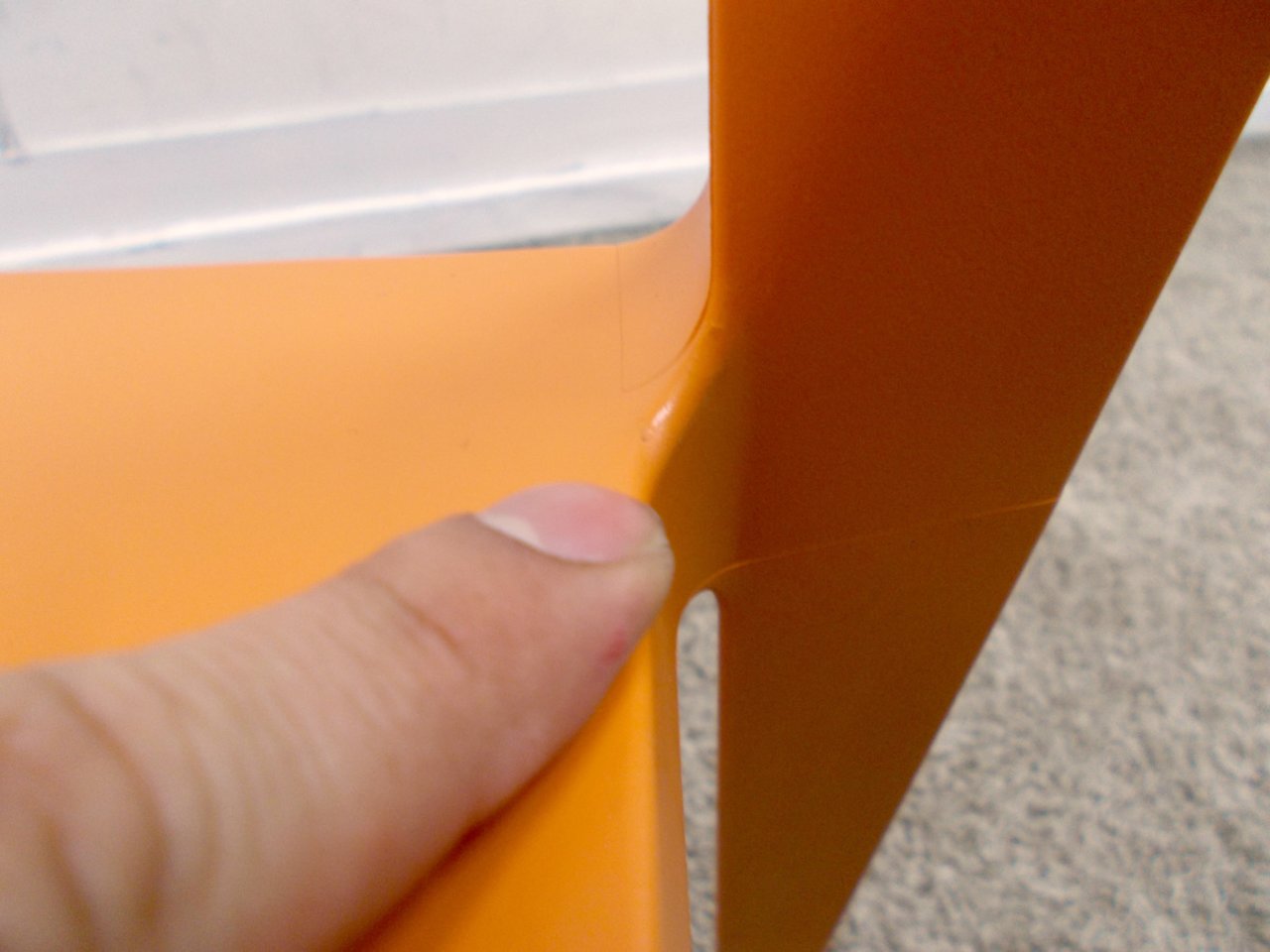 - かなり強い濃い黄ばみ・変色が商品全体にある。(例、座面・背もたれ、脚部等にある。)
