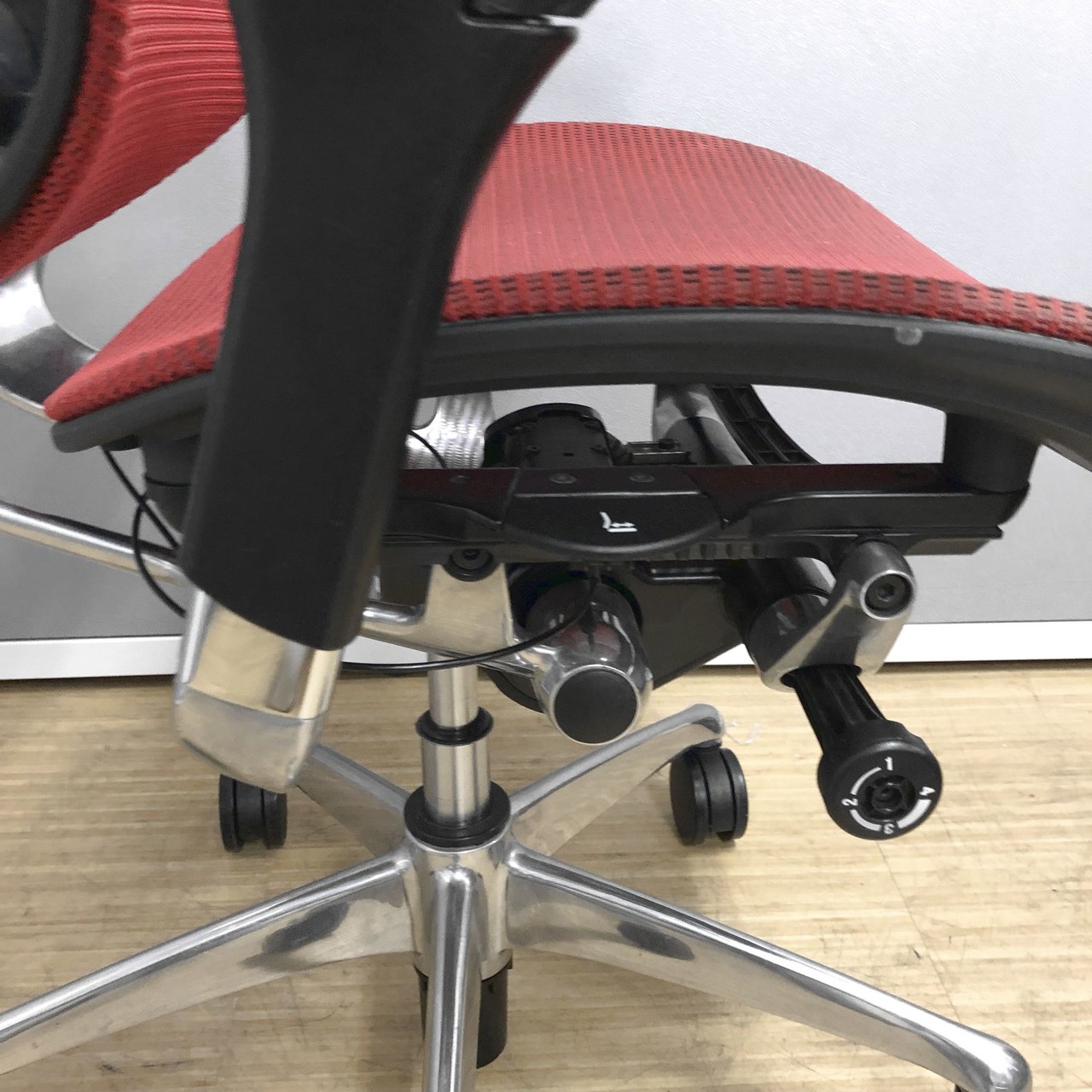 - ロッキングの強弱を調整するダイヤルがございます。体型に合わせてリクライニングの固さを座ったままで調整できます。
