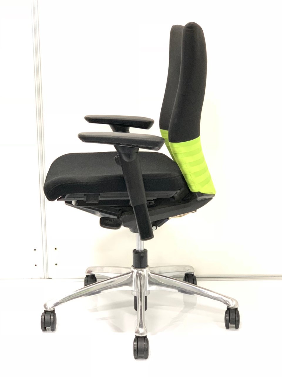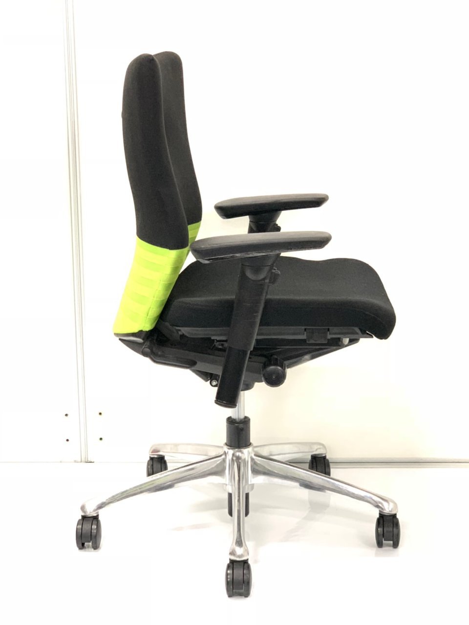【背あてのしなやかな曲線が背中にフィット!快適な座り心地に高級感のあるデザインが人気!】■オカムラ(okamura)製 フィーゴ(feego)チェア 肘付き ハイバック ■シームレスタイプ ■可動肘 ■ハンガー付き ■ライムグリーン ×ブラック