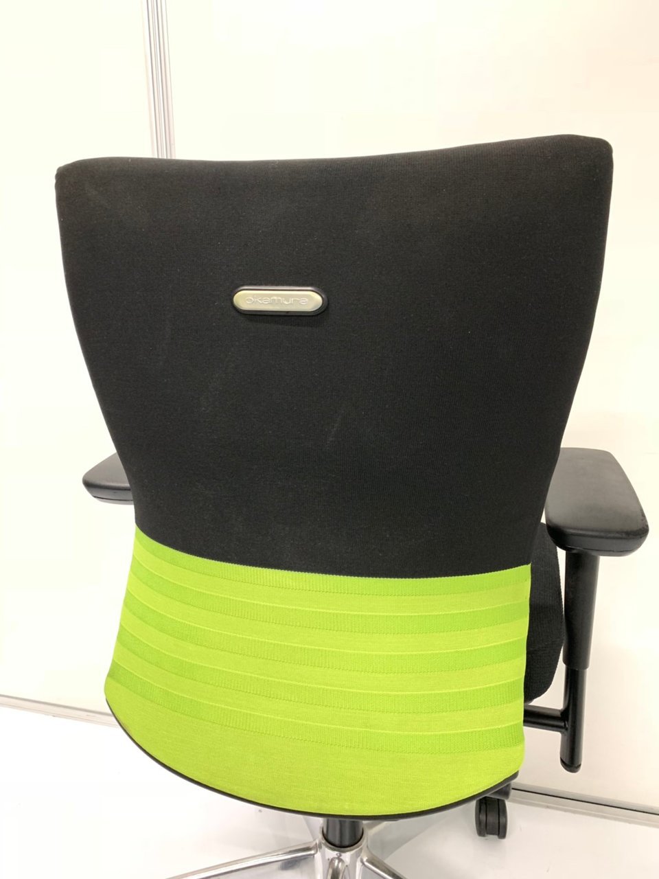 【人間工学に基づいた快適な座り心地! 背あてのしなやかな曲線が背中にフィット!】■オカムラ製 フィーゴチェア (feego) 肘付ハイバック シームレスタイプ ■肘付 ■ブラック×グリーン ■固定肘