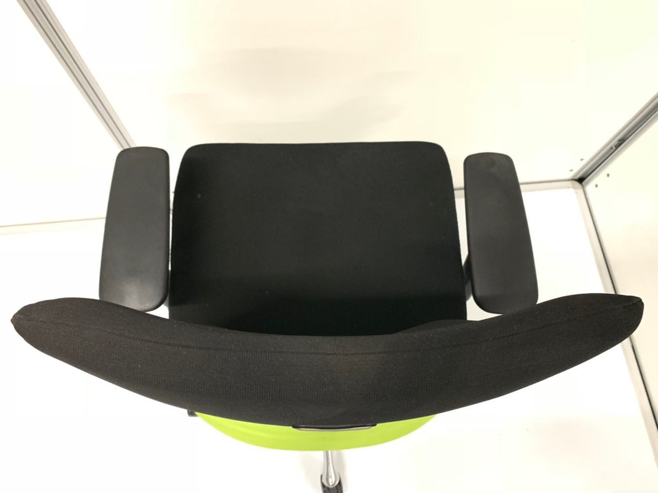【快適な座り心地で作業効率アップ!】■オカムラ フィーゴチェア 可動肘付 シームレスタイプ ライムグリーン ハンガー付 ※肘に擦れ・削れ・欠けありのためお安く!