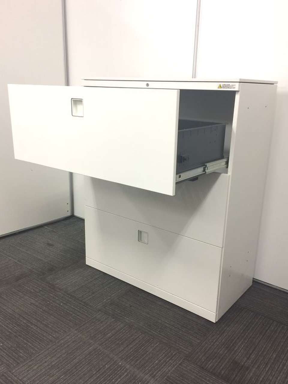 【使いやすさで選ぶならコレ!大容量の三段キャビネット】■オカムラ(Okamura)製 レクトラインシリーズ(Rectline) 3段ラテラル書庫 ローキャビネット ■天板付き ■シリンダー錠 ■ホワイト