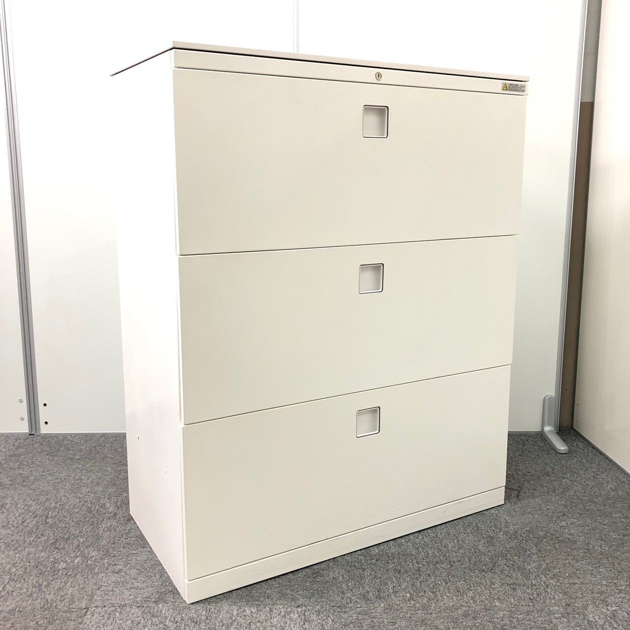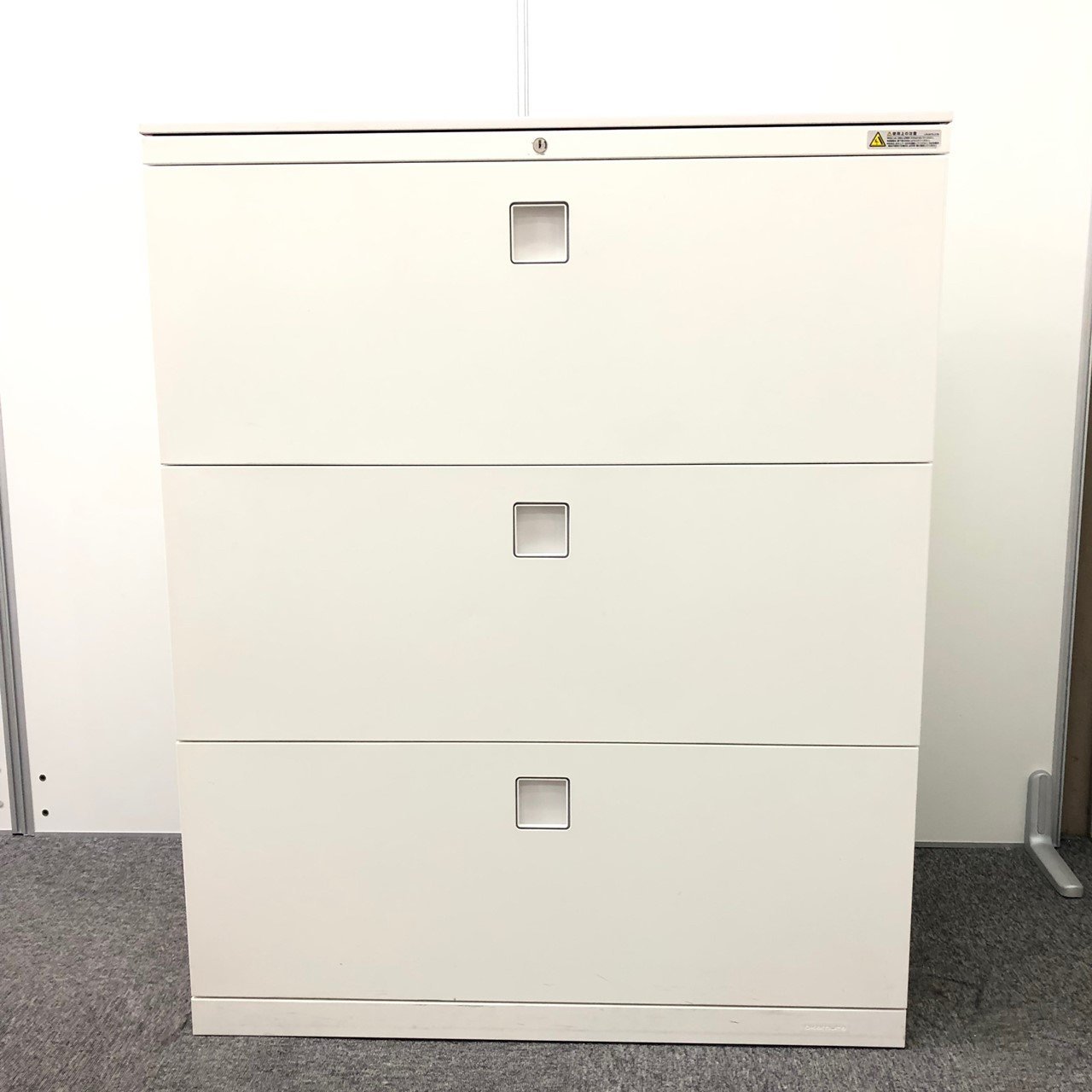 【ファイル収納にオススメ!高品質で使いやすい人気シリーズの3段ラテラル書庫!】■オカムラ(okamura)製 レクトラインシリーズ 3段ラテラル書庫 ローキャビネット H1100㎜ ■ホワイト ■シリンダー鍵 ■天板付き(天板:ホワイト) ※日焼け有