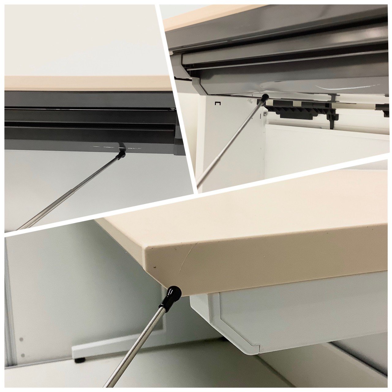 - 地震時、センター引出しが飛び出さないよう、ラッチ機構を装備。脚はデスクの横ズレを軽減させる設計になっています。
