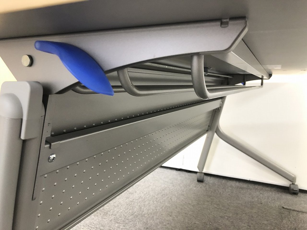 - 一部不具合あり天板歪み、アジャスター無し、キャスター使用不可ようなそのテーブルの本来の効用を果たすための機能以外の一部が使用不可な状態。(例、キャスターロッ ク機能使用不可、棚板無し等がある。)