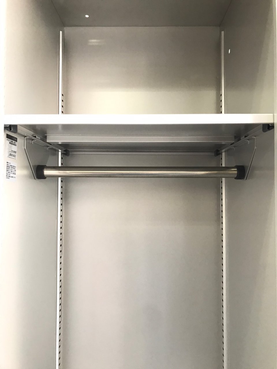 扉を開けて正面上には棚板がありその下にはハンガーが付いてます。