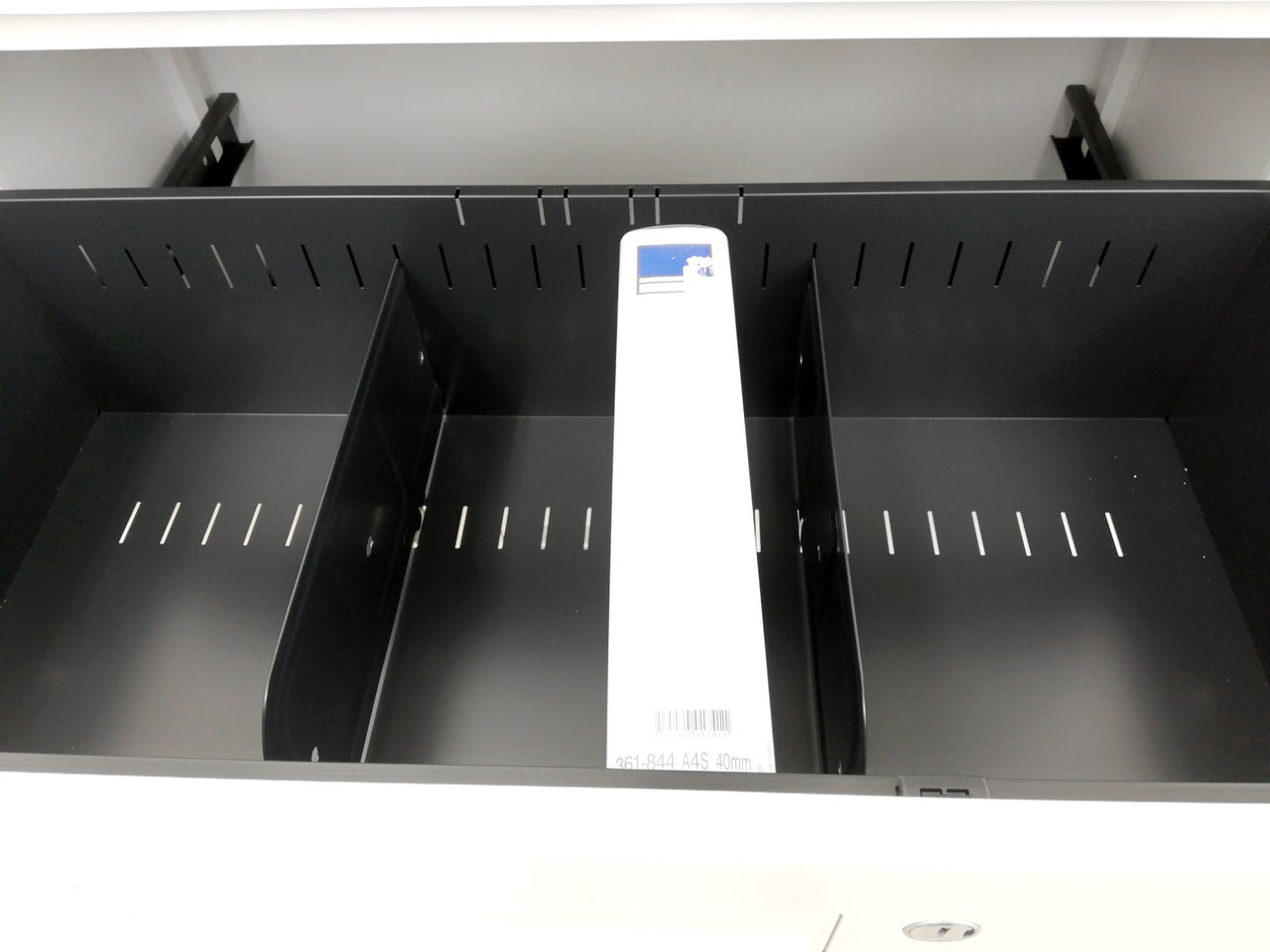 また、上段は少々縦幅が狭く、A4ファイルが2段、伝票ファイルのような小さ目のファイルがもう一段と、用途を分けて3段の使用が可能です。