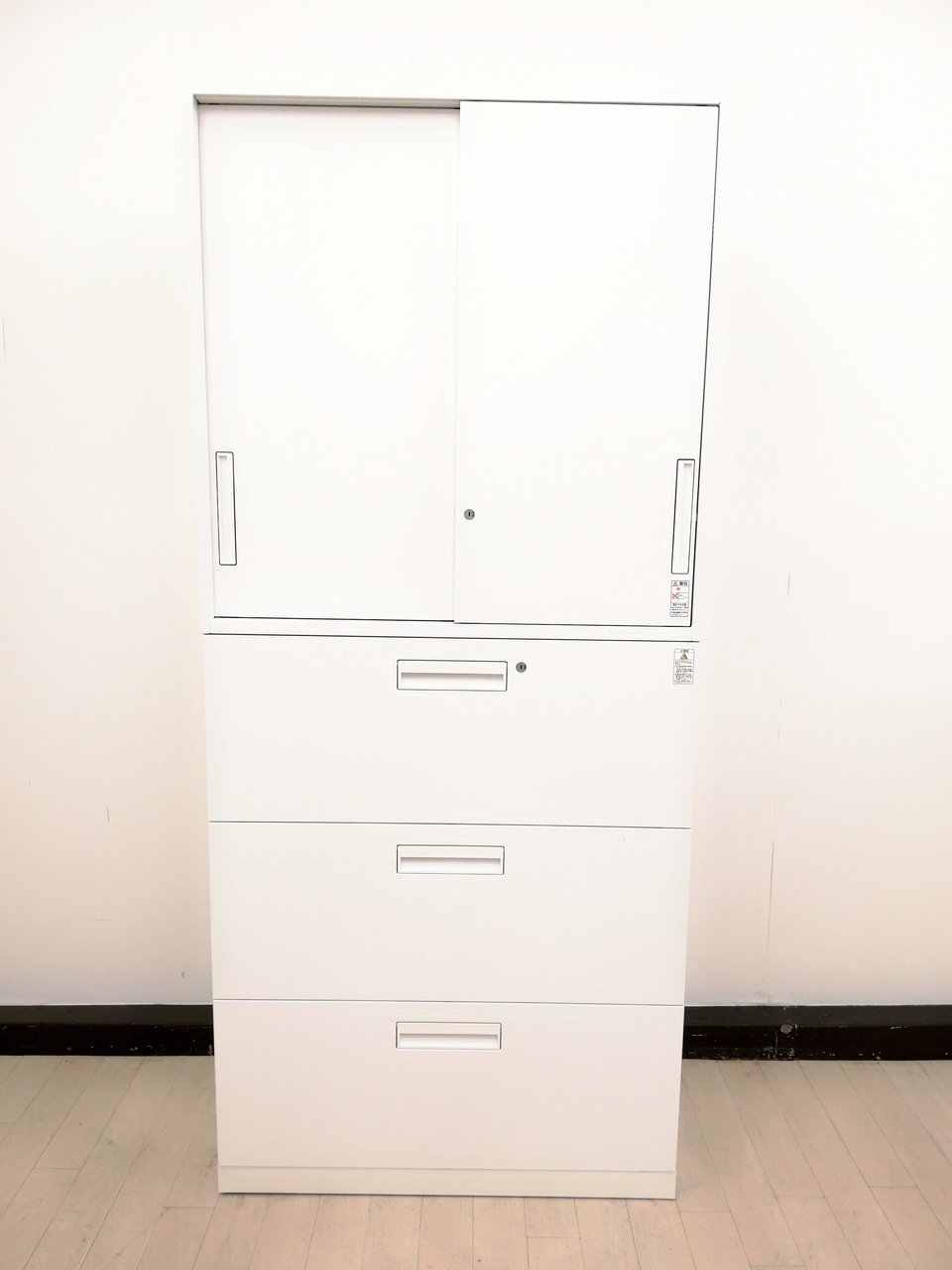 【オフィスの書類をまとめて整理!引き違いと引き出し式の書庫セット!】■コクヨ(KOKUYO)製 エディア(EDIA) 引き違い+3段ラテラル 上下書庫セット 2枚扉 H2150㎜ ■シリンダー錠 ■ホワイト
