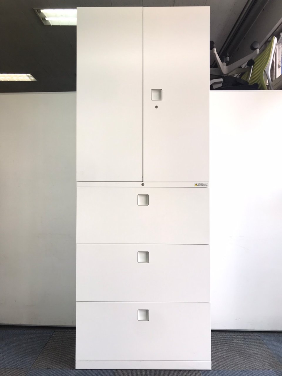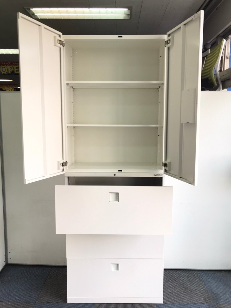【大量収納の上下書庫!パッと見でわかるオープンタイプと鍵付き引き出しのラテラルセット】オカムラ レクトライン 上下書庫(上:オープン 下:3段ラテラル) 《オフィスバスターズ福岡博多店は、福岡を拠点として、日本全国へ中古オフィス用品・オフィス家具を提供しております》