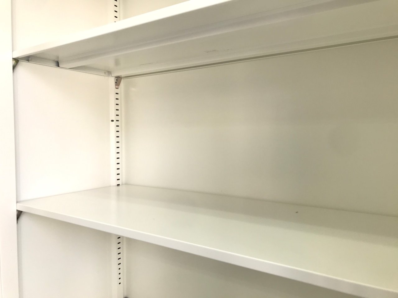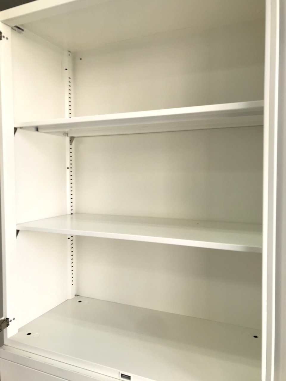 【両開きタイプで一見確認+最上段のみ浅型のクリスタルトレーのコンビ書庫!】■オカムラ製 レクトライン 上下書庫セット(上:両開き 下:クリスタルトレー)ホワイト 《オフィスバスターズ福岡博多店は、福岡を拠点として、日本全国へ中古オフィス用品・オフィス家具を提供しております》