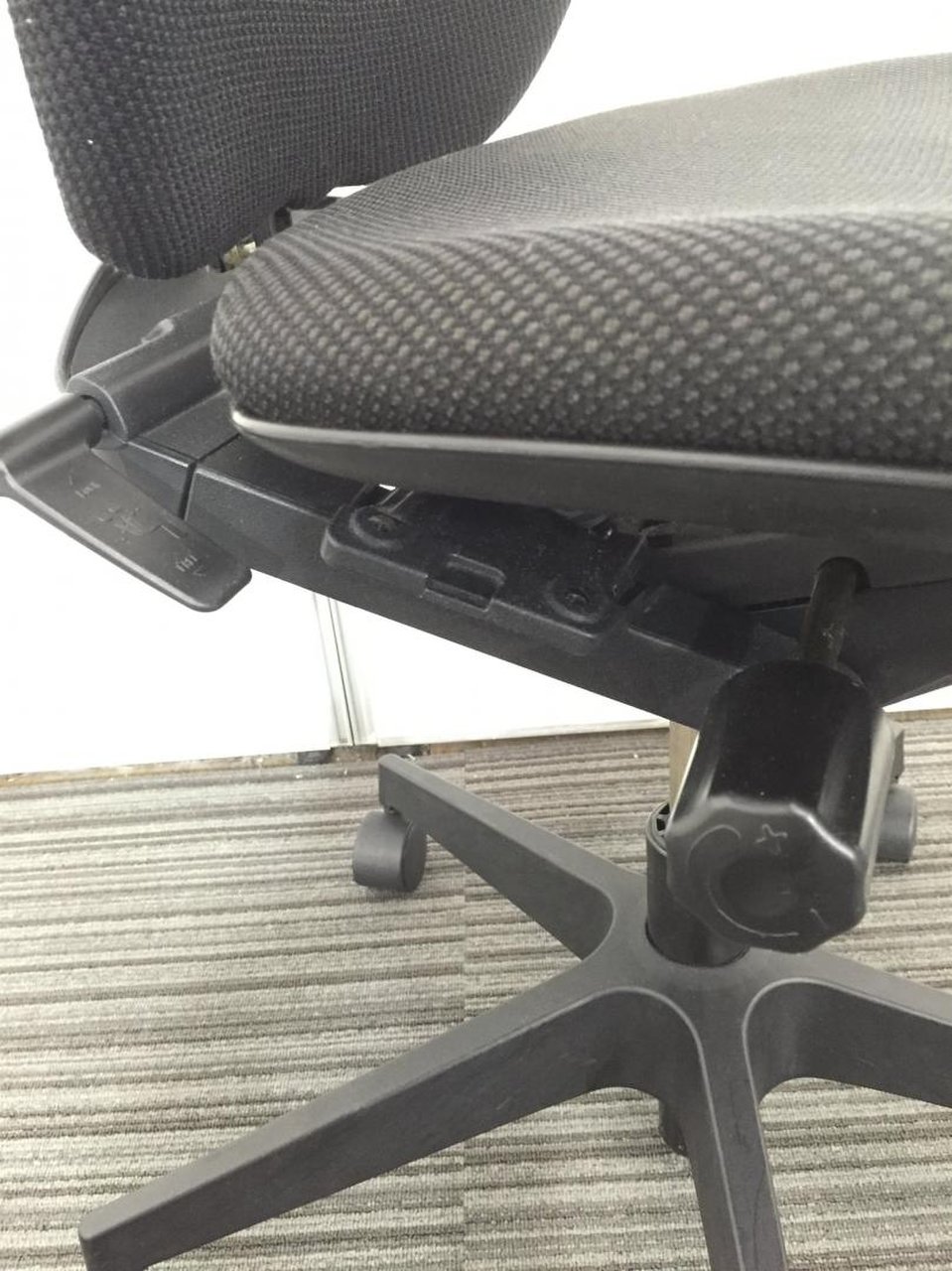 例えば、座面は、イトーキ独自の"ベンディングシート"という機構により、クッション、インターシェル、空洞という三層構造になっています。 この真ん中に挟まっているインナーシェルが、着座時の姿勢に合わせて体重を分散してくれるので、どんな姿勢でも体になじみ、疲労を軽減してくれます。 さらに、座面は前後に4センチほど奥行きを調整でき、前傾姿勢で座りたい、深く腰掛けたい、膝裏を圧迫されたくないなど、個人の好みに合った快適さにカスタマイズが可能となっています。